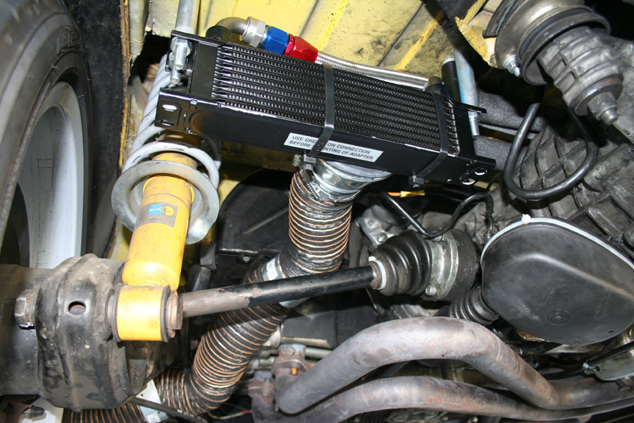Since I ran a Tangerine exhaust there was a big open spot behind the transmission. Cooler had the internal thermostate and never got above 200 even beating the snot out of it at the track in the summer. I DO NOT like the sandwhich method of routing to an oil cooler. Only getting a small percentage of oil gets cooled. Plus getting a short enough filter to get by the clutch cable / speedo cable is a pain. |