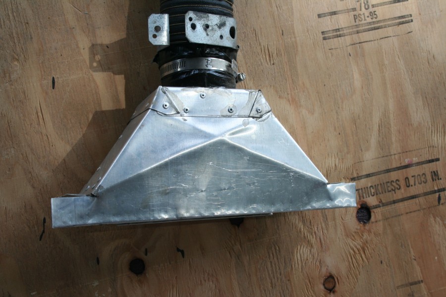Cooler under left side of trunk. I have a very low airdam in the front with not much air going under car, so installed a scoop in the left rocker panel with a 3 inch duct for the cooler. Got rid of the Home Depot cowl and fabbed one out of sheet metal. I also used the sandwich plate adapter. The one I used has a thermostat built in.