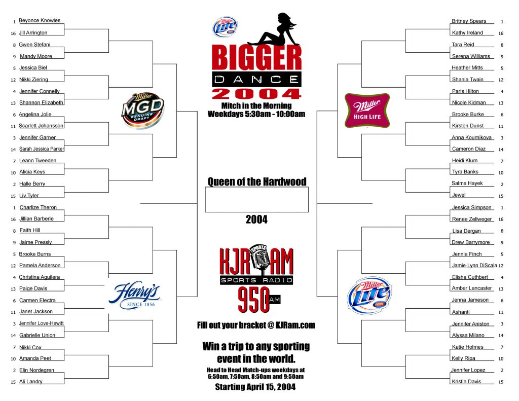 This has always been a popular office pool game every year at my office. It is based on the NCAA Basketball Championship tournament. But this is the one for the NON-SPORTS fans. It's based on famous women instead of basketball teams. Hence the title, "Queen of the Hardwood". If memory serves me, they pick famous women from different catagories; Movies, TV, Music and Models.