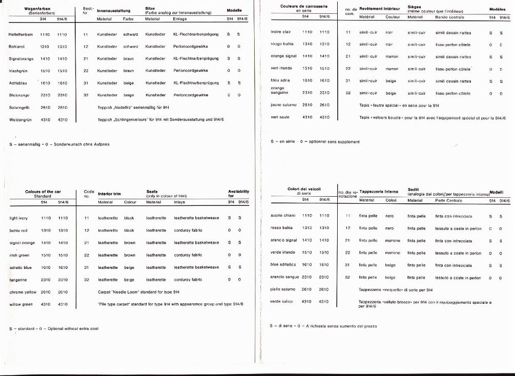 Tom, Nice interior (nicer than mine!). I have the tan corduroy inserts on my seats. Unfortunately my COA doesn't say anything about that. I'm not real happy with my COA, other than geting my engine number confirmed as original. I also had to track down parts thanks to DAPO. I scored a beautiful center console out of a really thrashed 914 in a yard in Witchita Falls, TX about 13 years ago. It was a VW yard, and the owner hated the 914, since nobody ever bought parts from it. I got the console for 10 or 15 bucks! Scored the steering wheel the same way, from a place in Phoenix who only wanted to deal with 911s, but had a couple old parts 914s out back. My car has been like a scavenger hunt (2.0 rims, console, steering wheel, original-style Balupunkt, tan backpad and uncut door panels, luggage rack, etc)! Brent, that's an outstanding deal - needless to say I payed more & I'm still looking for a Keinzle clock! Don't do the luggage rack - waste of time with 2 trunks & adds 4 holes for potential future rust problems IMHO! You may have to keep asking them to look at the actual Kardex & read to you whether it says "#31 Beige leatherette/basketweave" or "#32 Beige leatherette/courdoroy" & then to send you a corrected COA (at no charge to fix it). Call PCNA & ask for Kristin Rochford & explain the problem, & see if she'll check it for you - or email her at: coa@porsche.us I had to go round & round when she & her mgr. insisted that #31 was black #11, so I had to go to the Customer Service GM to get him to correct after 3 tries. PM or email me if you get to the point where you need his name & email/phone. This is the codes for 72 MY, but 73 is the same & this is what I sent their boss to get it fixed. - (IMG:style_emoticons/default/popcorn[1].gif) |