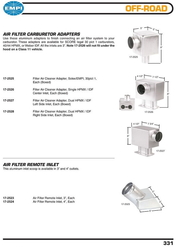 If you want, I have the early 912 aircleaner housing and new elements. The pass side fits, but the drivers would need to be modified as the cyl's sit about an inch too far forward. I even have the adapter plates from solex to weber base's. Maybe this is a better option. Do these flow enough air, or are they restrictive? Zach |