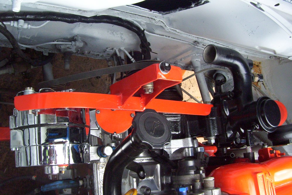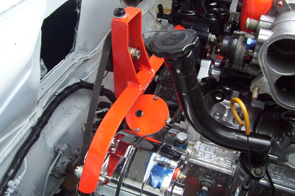 I spent about 8 hours making this bracket out of a single piece of L channel and some 5/8 DOM. I wanted to use the serpentine belt tensioner. Seems to work good. It was a pain to get the alignment... The curve was easy. I cut the slot first. Then I cut off the inside piece. made some releif cuts in the main section and bent the channel. I welded it back up. Bent the inside curve piece and welded it on. smoothed it all out with a grinder.