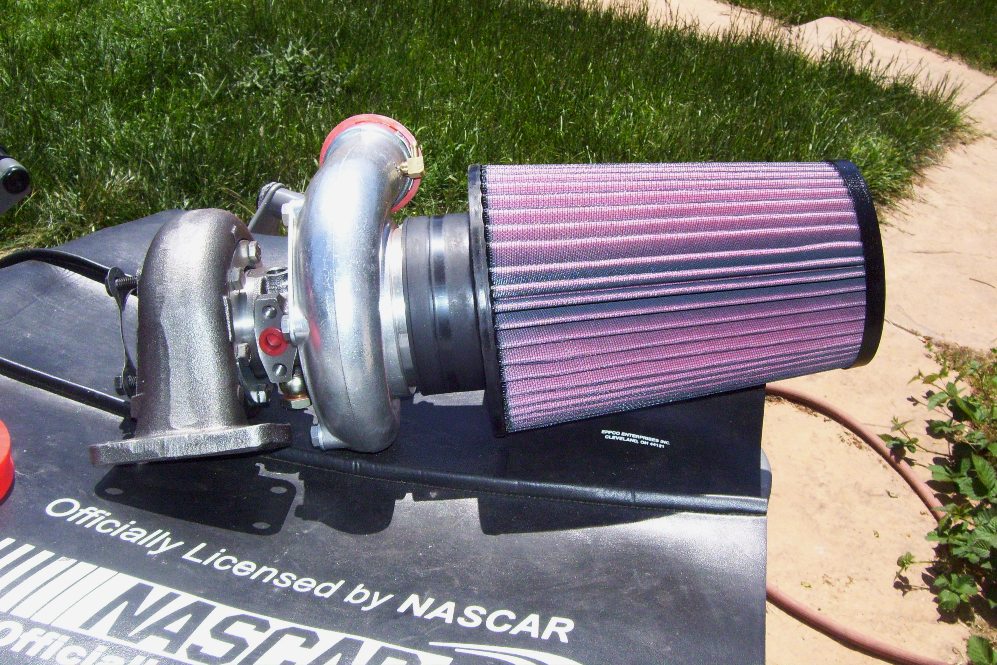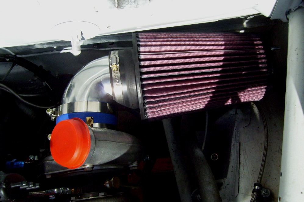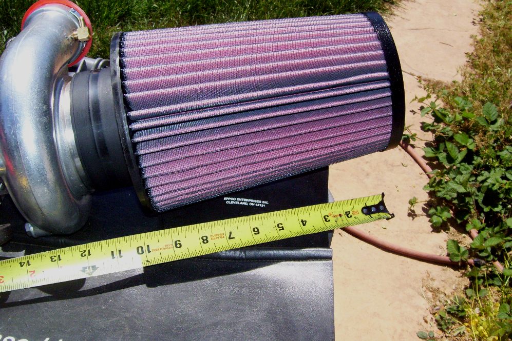 Well I'm mostly down to booring stuff and puch list items. The major stuff I still need are a clutch, air/water intercooler, Oil Cooler and lines. Time to save some money from my new job. My new Air Filter came in. Krusty won't like it because it's a K&N. 4 inch ID by 10 inches long. I have to get a 90 degree fitting to turn the filter in front of the turbo. Otherwize the filter will be half inside the cabin. I needed high flow for the inlet, that's why it's so massive.