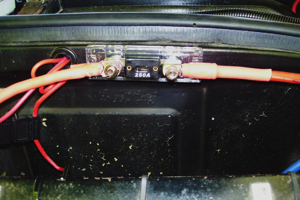 My starter cable routes from the cut off then to the battery. All other power is routed from the cut off to this 250 Amp fuse. This will give the system some protection from dead shorts. The circuit path is: Battery, to Cut Off Switch, then 1/0 to starter. Battery, to Cut Off Switch, then #2 to the 250 Amp fuse. This set up does not kill the alternator but will isolate it from the battery and other electronics. |