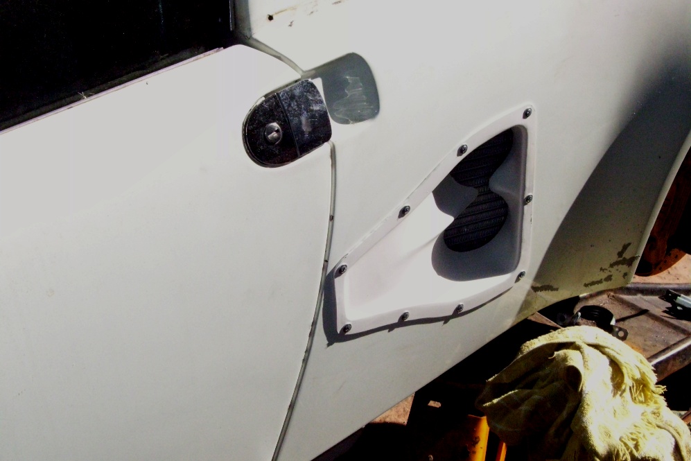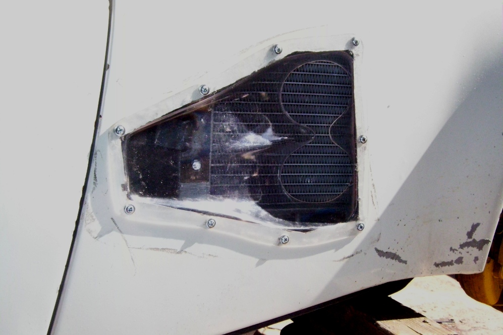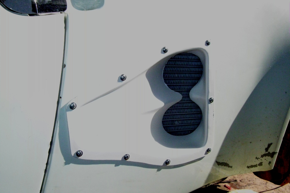 I installed the intercooler heat exchanger in the rear quarter panel. It is ducted with a NACA duct into the fender. It was hard deciding to cut the quarter panel but, it can be repaired if I don't like it. Im using the 914-6 oil tank knock outs to route the coolant hose to the intercooler. There will be a fan on the back side of the heat exchanger to pull ari through it. I have to fab an inner fender skirt to shield road debris. Im thinking of louvers to send the air down in the same direction of the tire rotation. This should create a slight draw of air when in motion. Here are some pics... |