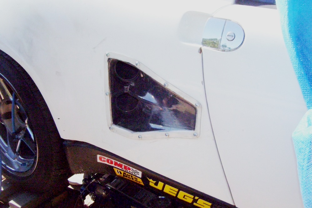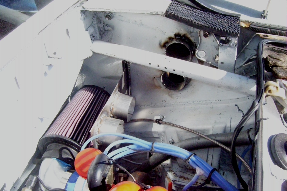 Today I worked on the cold air intake. I used another NACA duct (can't have just one). I built a steel box, hemmed the edges and fitted a gasket where it touches the body. I need to fab the top still to enclose the air filter. I used 3" tubing welded to both the box and the side firewall. I will connect the tubes to the NACA duct with brake cooling hose. I built this old school since I don't have a metal brake. Blood sweat and tears... And a BFH! Hand hammered all of it and used some 1x4's and clamps to make a getto brake.