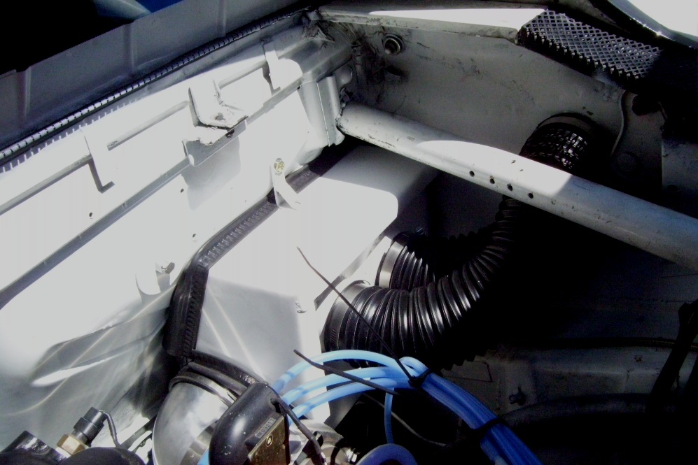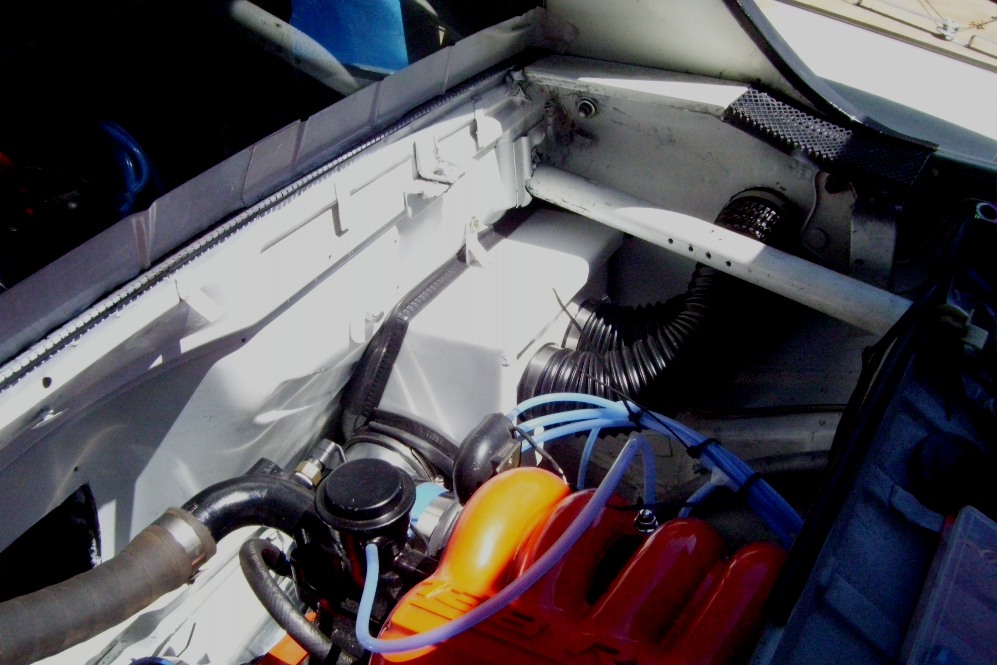 Big push on the car this weekend. About 11 hours today. I had to go backwards a little. I realized my turbo flange gasket was missing. I had to unbolt a ton of stuff to get the turbo off. Then I realized the mounting bolts were to short. Along with everything else I was doing I made 3 trips to the auto parts store, 2 trips to orchard supply hardware and 2 trips to the HD. I lost my clutch mounting bolts. They are new and in a bag in a safe place somewhere in the garage. Nobody had hardened metric bolts. I had to old school it by hardening the bolts myself. Heated them until red hot and dunk in a can of old oil; repeat several times. Not sure the actual hardness but they will work for now. Clutch is in, new bushing on the fork. I finished the top to my fresh air box and got it plumbed to the outside. My radiator overflow tank is mounted. Most of the misc loose bolts are now tight. I mounted the heat exchanger fan in the rear quarter. Need to find a pump and plumb it. Tomorrow I will try to finish the cooling system by replacing the under body hoses and finish my shroud modifications. I think I can have this running by August. I pulled the motor in November. This has raken way more time and money than I originally thought.