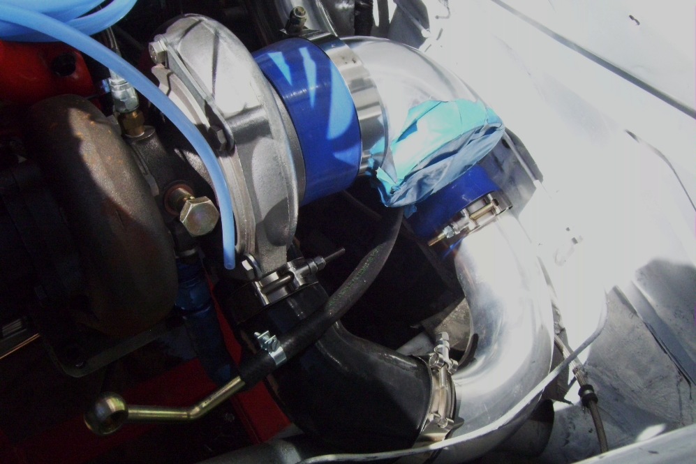 I had to clock the turbo outlet to the passenger side and use a U bend to get it in front of the motor. Two 45's later and its into the intercooler. Just need some more couplings to show up and it's done...