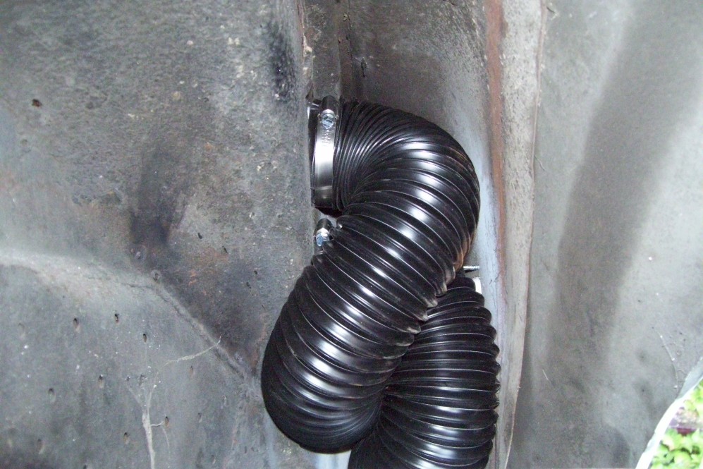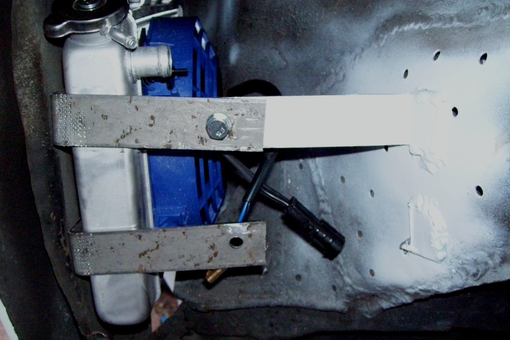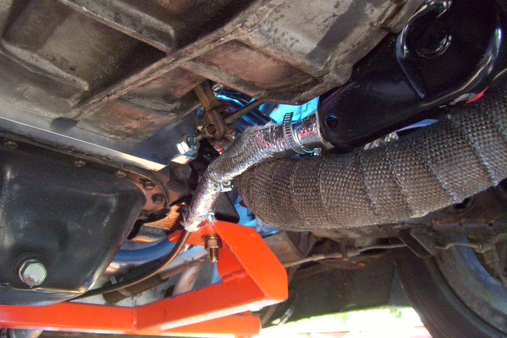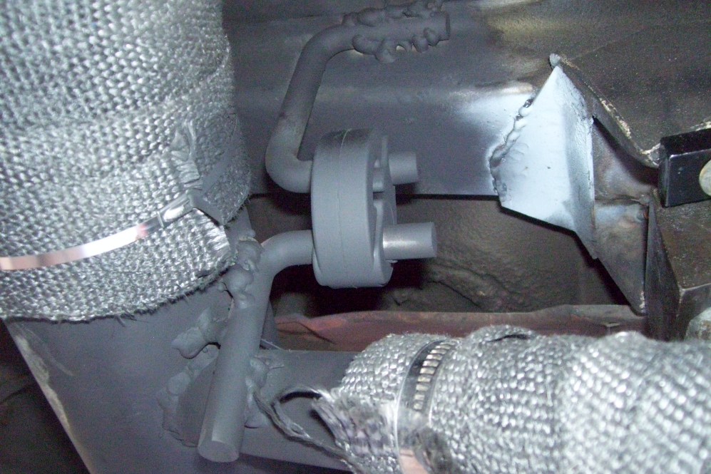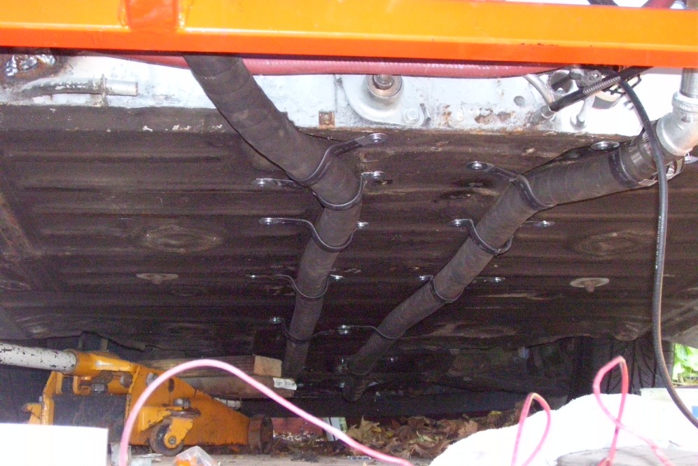 Here's a shot of the under car water lines. They run in the factory indentations and hang down about 1.5" below the car. I have hit speed bumps with my old lines with no adverse effects. There was no damage to the old lines. I just wanted to install new larger lines. Some people like copper but I would have ripped the copper apart many times over. I used insulated Adel clamps with an added layer of shrink tubing.