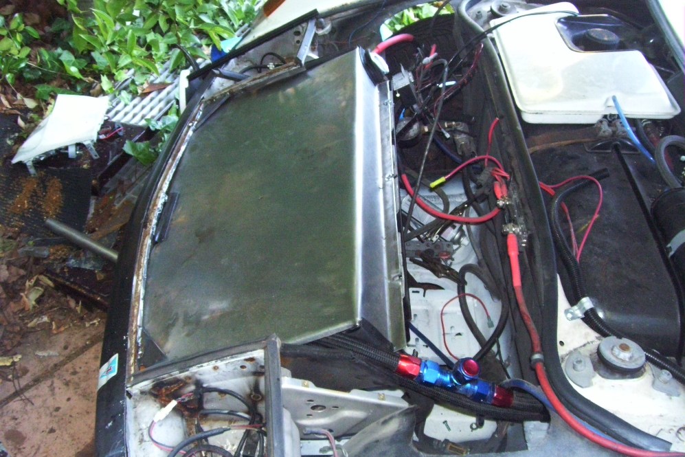 Today I tackeld the cooling system. I used some 1-1/8 ID high temp hose. I was running 1" green stripe hose. The added diameter should make a huge difference in flow even though the increase is small. when routing my hoses, I found the front trunk pan was cracked in 5 or 6 places. It was from the battery tray being bolted by the PO and then racing with it. Shitty setup. So I had to repair the pan before I could continue. I then welded the battery tray to the floor in 8 places. The floor pan has no flex anymore (IMG:style_emoticons/default/piratenanner.gif) I fabed up a new shroud to cover the added oil cooler and radiator. I'm actually getting good at bending sheet metal getto style. I need to buy a brake! HF having any sales? The radiator floats on rubber isolators. No bolts to the car. I had to make a few more trips to HD and the hardware store. I made a copper reducer from 1-1/2 to 1-1/4(they didn't have one I could buy). None of my Renegade hose adapters would work on the lower rad outlet. I also ditched the Renegade water filler tank for an inline 1-1/4 unit. The rotary engine needs 13psi caps so I got 2 new ones. The one on the radiator is a Mr. Gasket unit with built in thermometer. I removed the clamps on the fuel lines only to discover I left a fuel line loose under the intake manifold. I think I have to pull it off to get to it. Once that is done I will check all the oil lines and coolant lines. I think I can fill 'er up with liquid. This is the start of my 9th month of this engine conversion. I'm ready to enjoy driving it for a while...