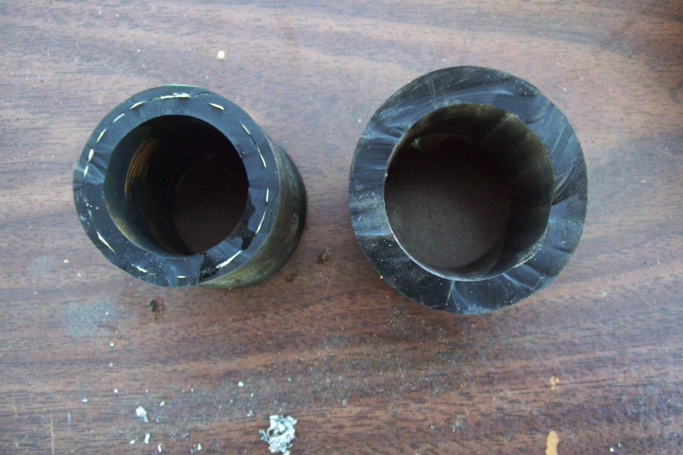 Here's a comparison of the Gates green stripe hose (Left) to the new 1-1/8" hose I'm running (right). Also pictured are the Renegade reducer fitting(left). Notice the reducer is 1-1/4" to 7/8"-3/4". The fitting on the right shows the smallest size I'm using 1-1/4" but I'm stepping up to 1-1/4" entering all devices. The 1-1/8" hose can strech over the 1-1/4" fitting. Clearly the Renegade reducer flows less than my new system. I had atleast 3 of these reducers on my V8 system. These larger reducers should help the stock RX7 water pump move liquid.