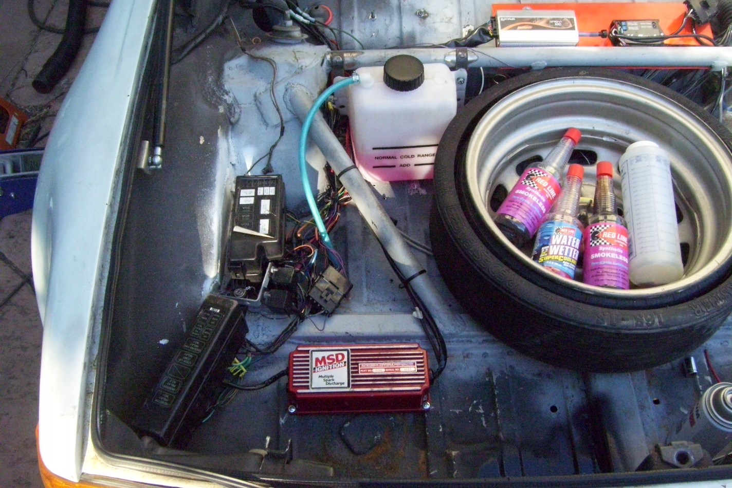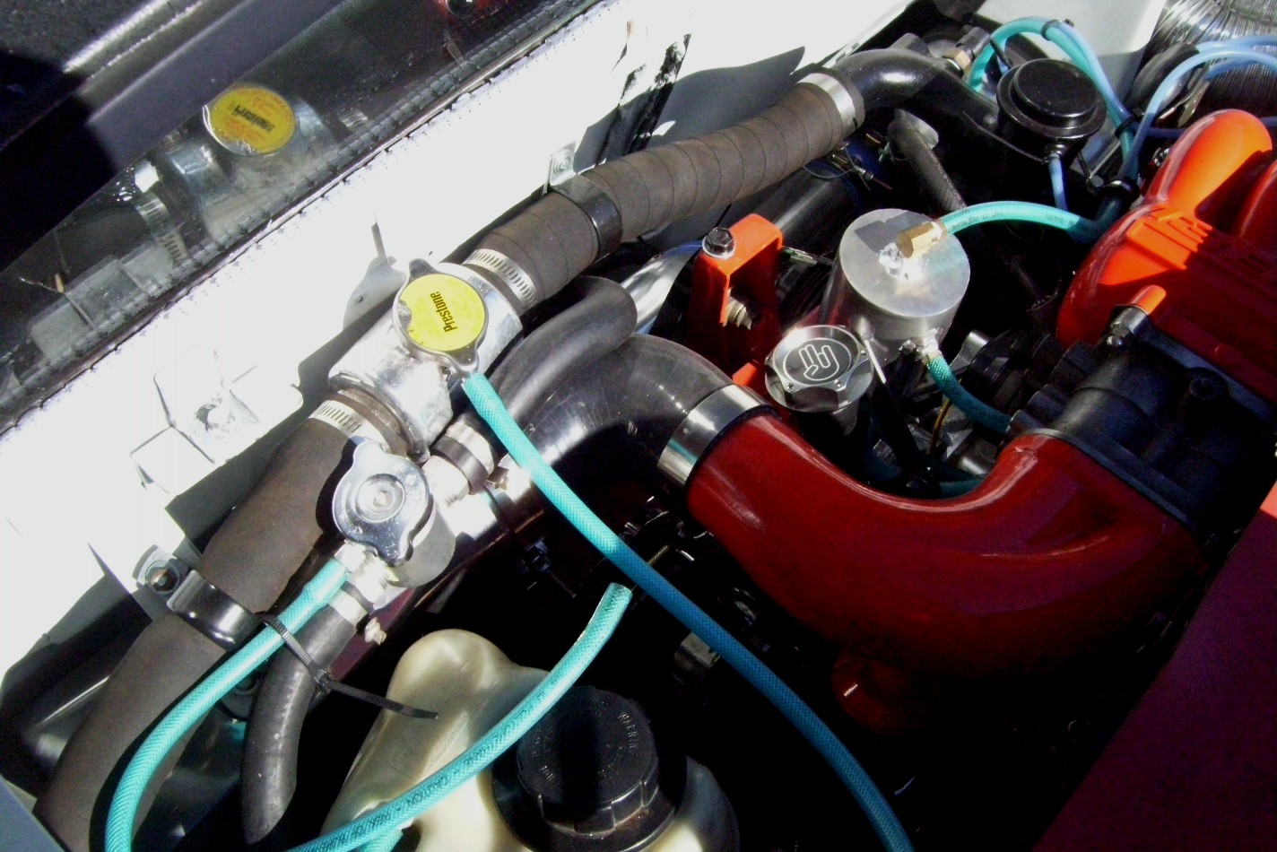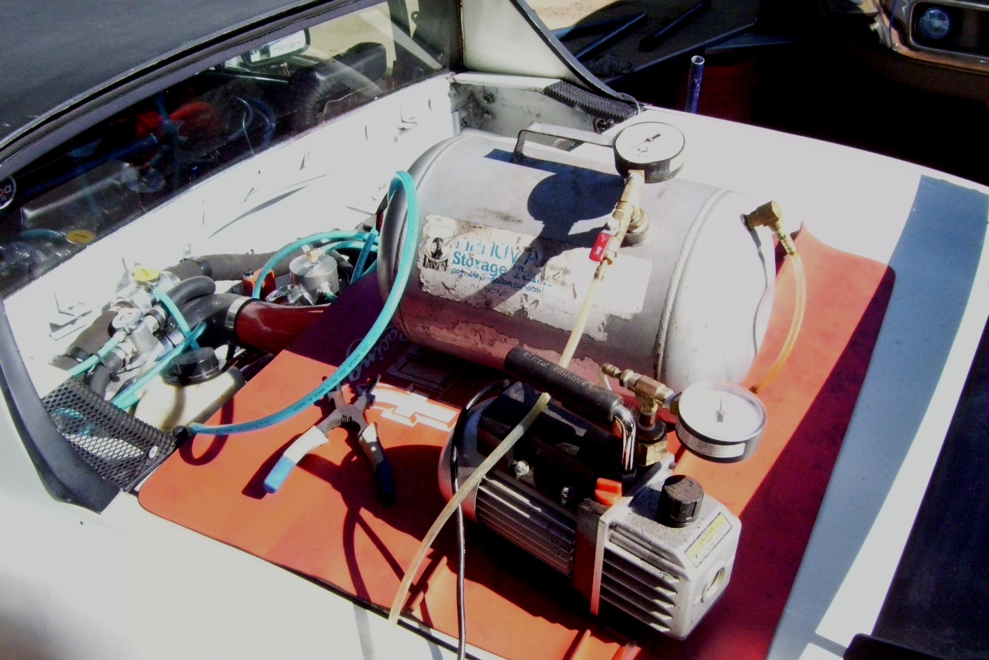 I'm going to play with fuel maps more and see if I can get it worked out. Either way I plan to have it to the breakfast next saturday. Here is my badge (Thanks Jim). It looks cool except for the speckles of tranny oil from my drip. I use this setup to suck all the air out of my cooling system. Vacuum pump pulls on the storage tank. Storage tank pulls on the closed cooling system. This forces all the air out. I then pinch off the line, remove it from vacuum and put the hose in a tank of water. Then release the clamp and the cooling system sucks water back in. I leave the vacuum sucking for about an hour at a time. I do this every time I run it for a couple of weeks, or more often on a whim. It's kind of anal but my V8 ran between 160-180F. This motor in known for running hot. When you overheat a rotary it's rebuild time (IMG:style_emoticons/default/sad.gif) |