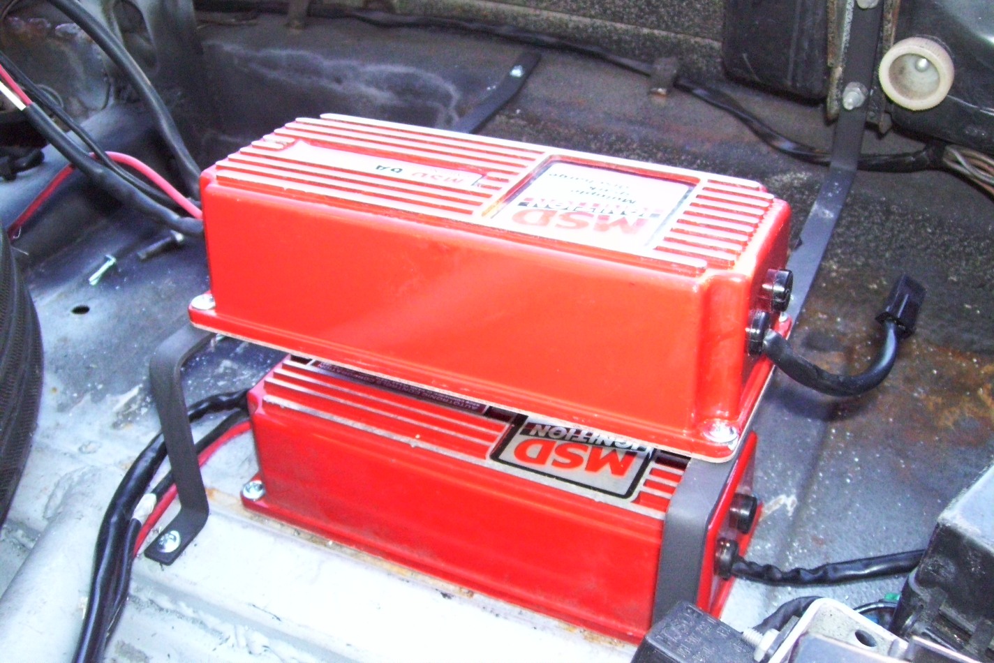 Here is the first of 4 MSD boxes. There will be 2 mounted side by side and 2 above. I have designed a simple bracket to float two on top of two. This way I can maximize the real estate. The targa top will still clear everything. The 4 coils will go in the engine bay on the rear firewall, drivers side. It is very crouded in my engine compartment now. Big difference from just the short block mocked up.