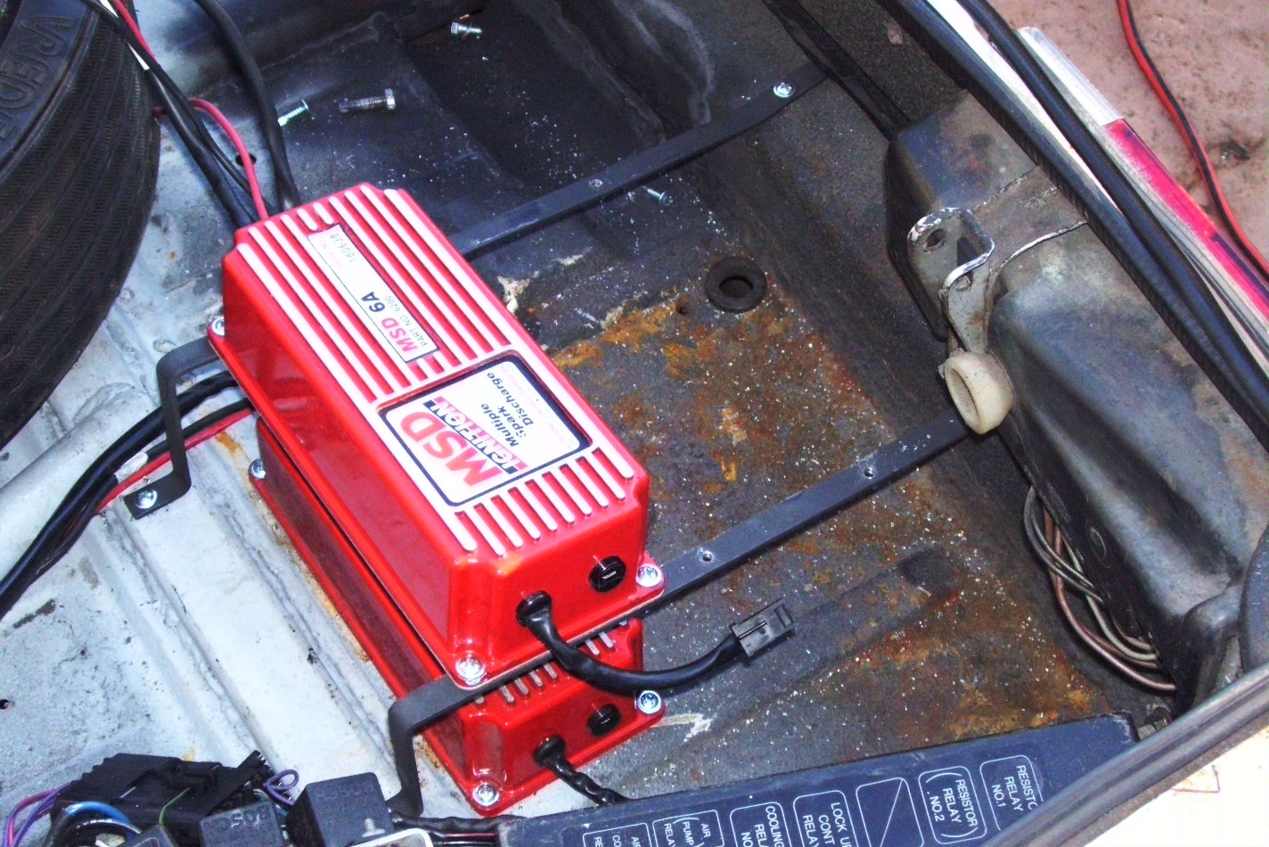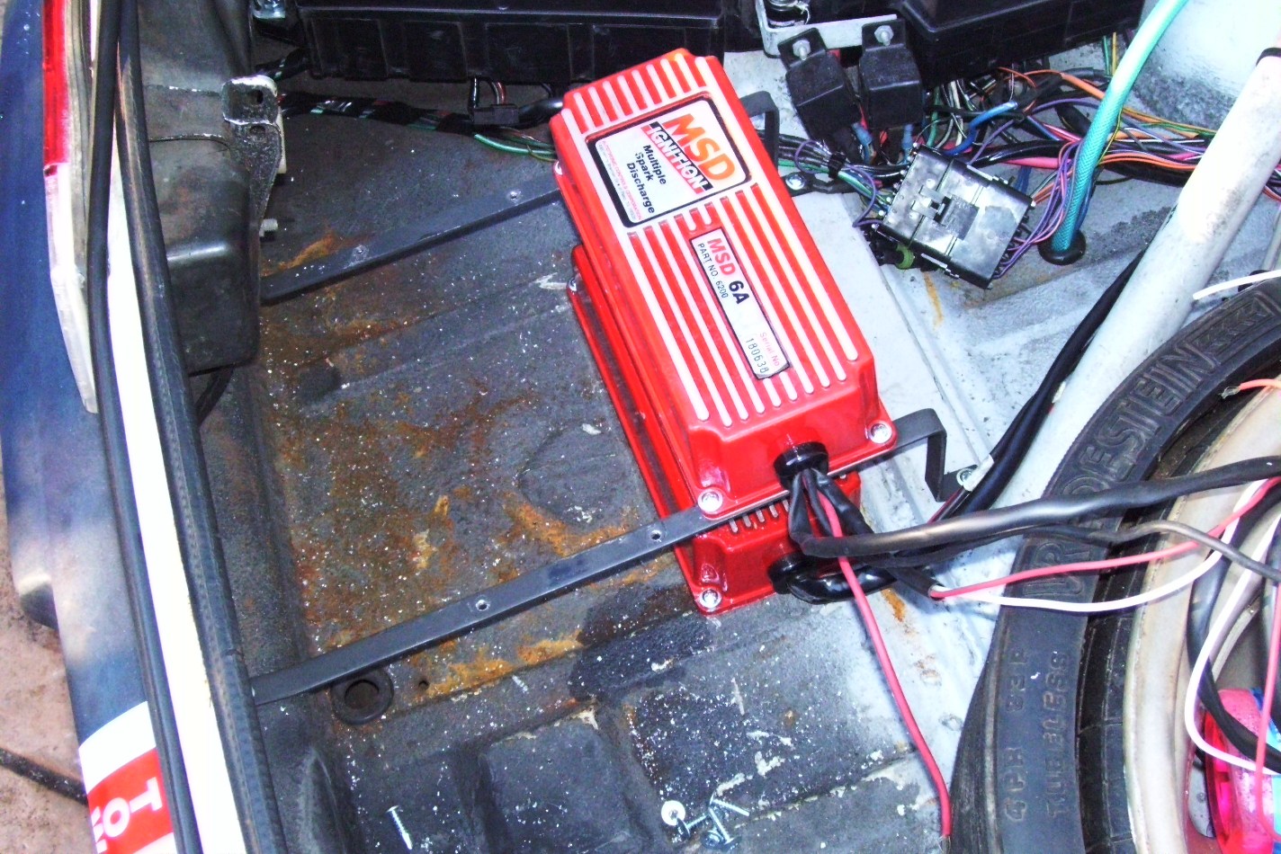 2 of 4 MSD boxes in place. The bracket is a simple 1/2"x1/8" bar stock. I used the two taillight housing nut to secure one side. The other corners with self tapping screws...