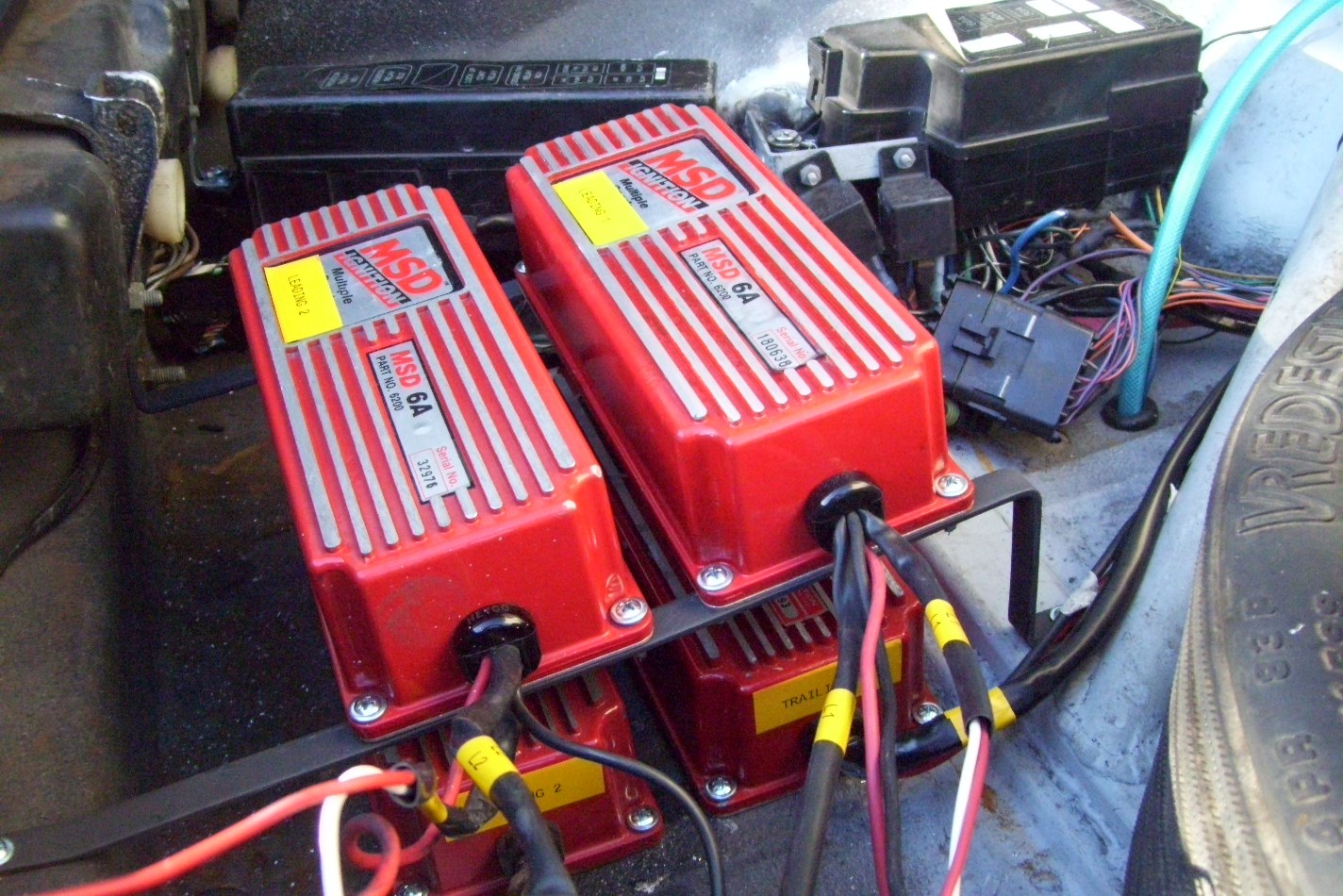 All 4 MSD boxes installed. I used a label machine to bust out tags for the boxes and cables. Leading 1 & 2 and Trailing 1 & 2. Now to get it wired and connected to the 4 coils (whenever they show up). I hope this fixes the plug fouling and bad spark problem (IMG:style_emoticons/default/biggrin.gif)