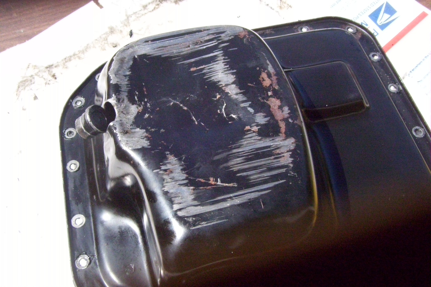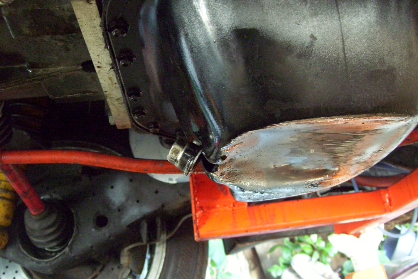 Well, on the way to the 914 reunion I broke down on the freeway. They are repaving 680 NB by my house. They have ground down the road bed 2-3 inches. At the transition of an overpass the built an asphalt ramp on the freeway. I got airborn in the rear at 75mph. When it landed it hit something on the road bed and peeled the oil drain bung right off the pan. The bottom of the oil pan is almost exactly the same as my engine mounting bar. I connected the factory low oil switch to my dash mounted check engine light. That's how I knew something was wrong. The smoke and oil all over the road was another clue. I think I got lucky and I hope the engine is OK.