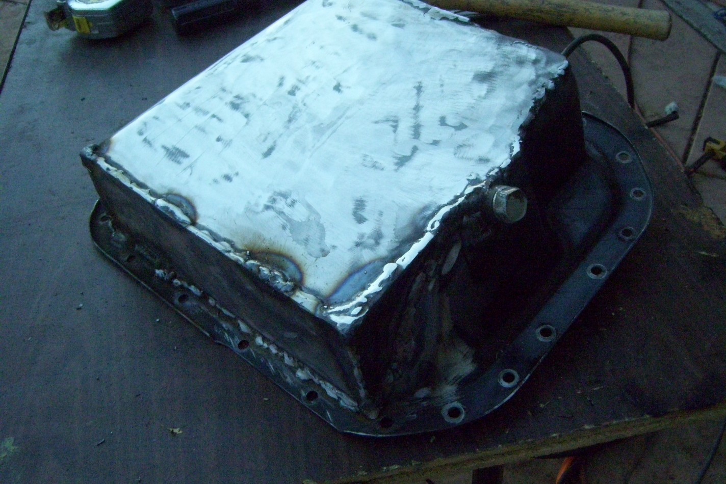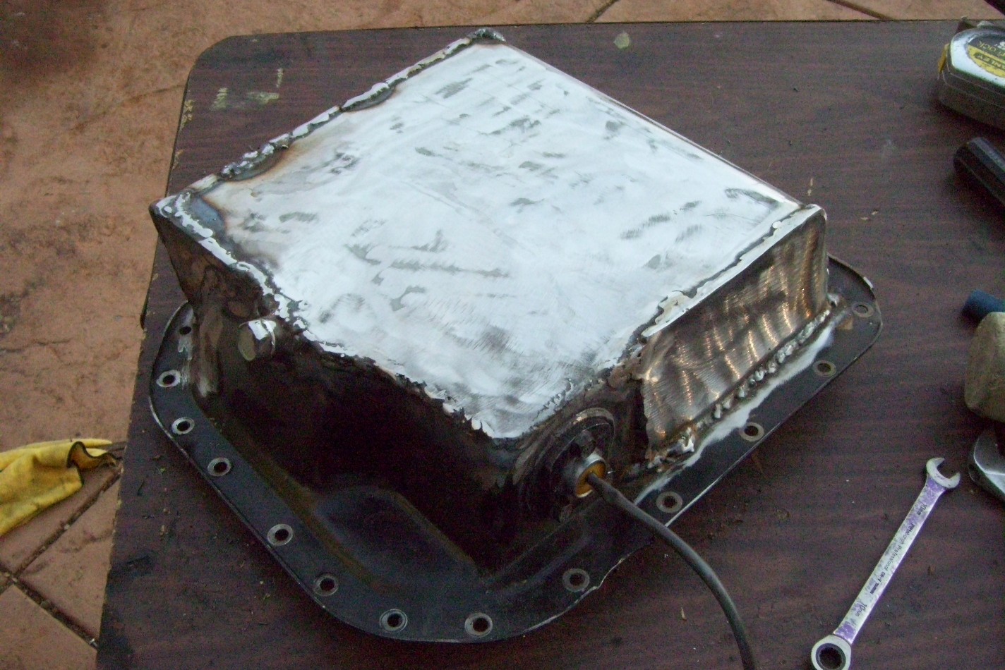 I took some advice from McMark when fixing the pan. I shortened it by 1/4-3/8 inch and built kick outs to hold extra oil. Not my best welds but I had to keep fixing leaks. I built it with 14ga steel I had. The extra sump is semi isolated with baffle trap doors (hinges). They open to the center, to the pickup tube. I think I almost doubled the capacity. Here is my side yard. It is 20 feet wide by 60 feet long. I knew I should have installed concrete there (IMG:style_emoticons/default/dry.gif) |