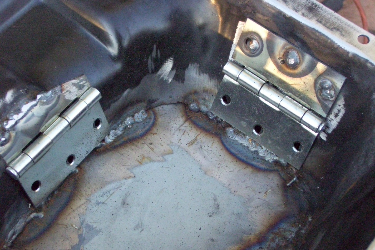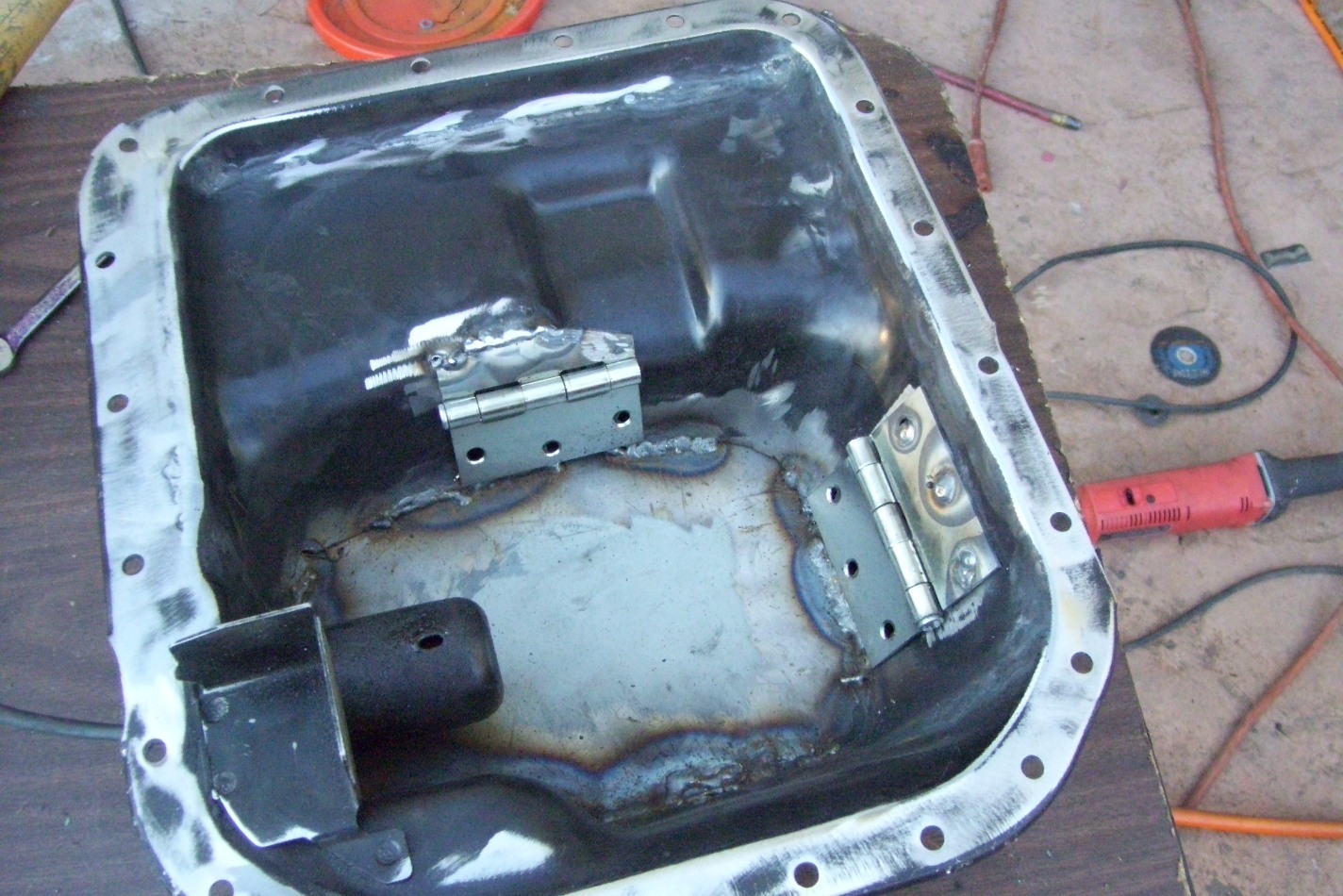 AHAHAHA! I love the use of the 5 knuckle plain bearing hinges! Very good fix! This is exactly how my road racing oil pan on my V8 was set up. Hope i didn't infringe on any patents... (IMG:style_emoticons/default/biggrin.gif) |