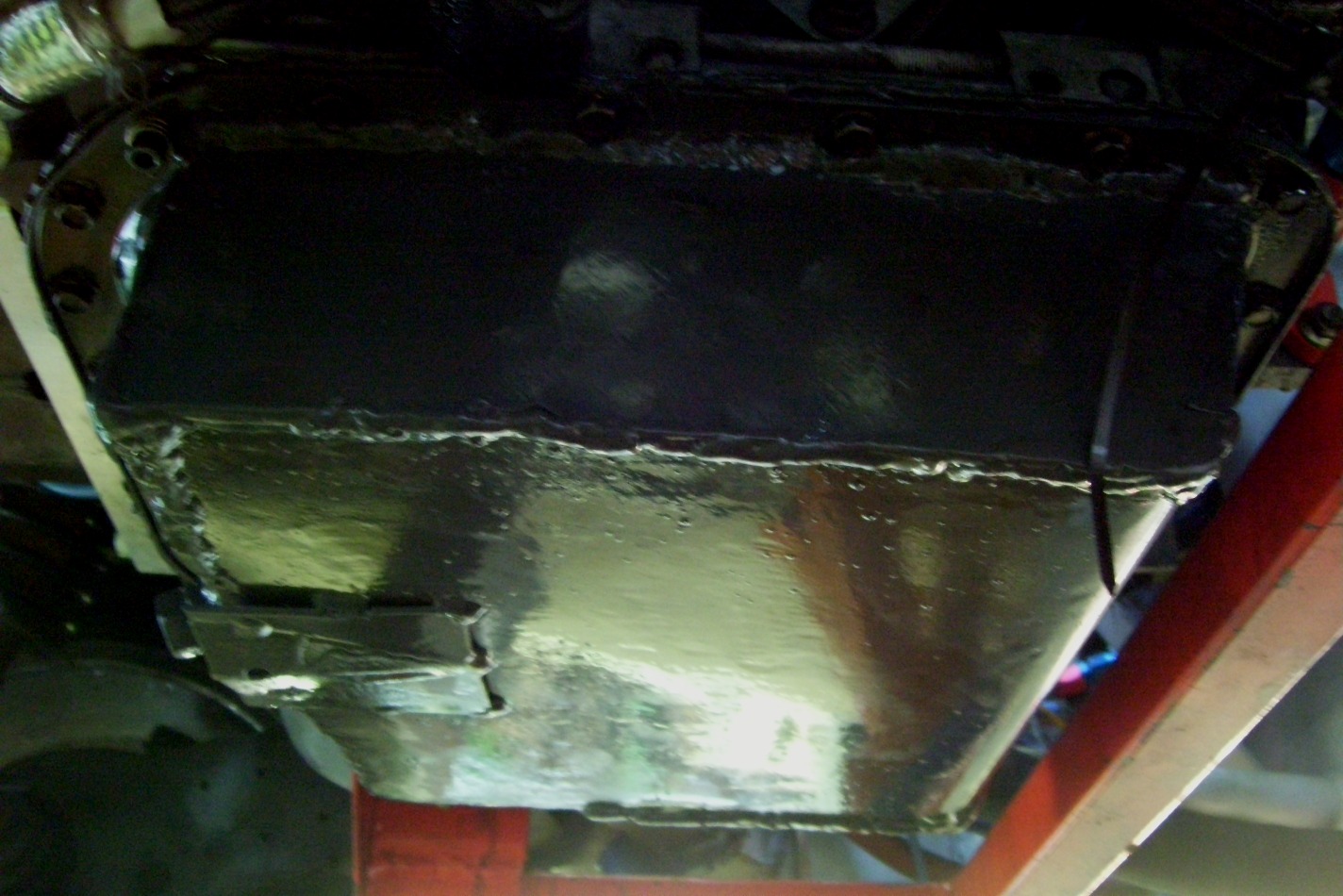 Got the oil pan back in. Pretty easy fix and more volume and strength. I added a littler skid plate to the rear of the pan.