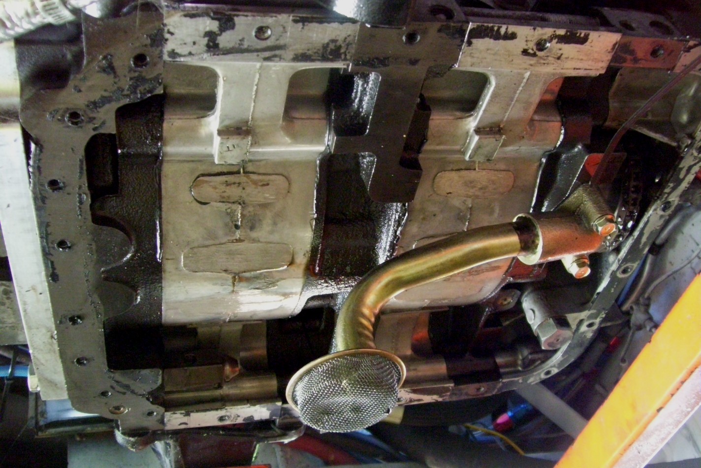 This is what it looks like inside... Not much. Oil pick up tube and oil pump chain are visible. I had to adjust the pick up tube some. I used a jack, block of wood and a folded rag to lift the pick up to its new pan depth. Worked out good. |