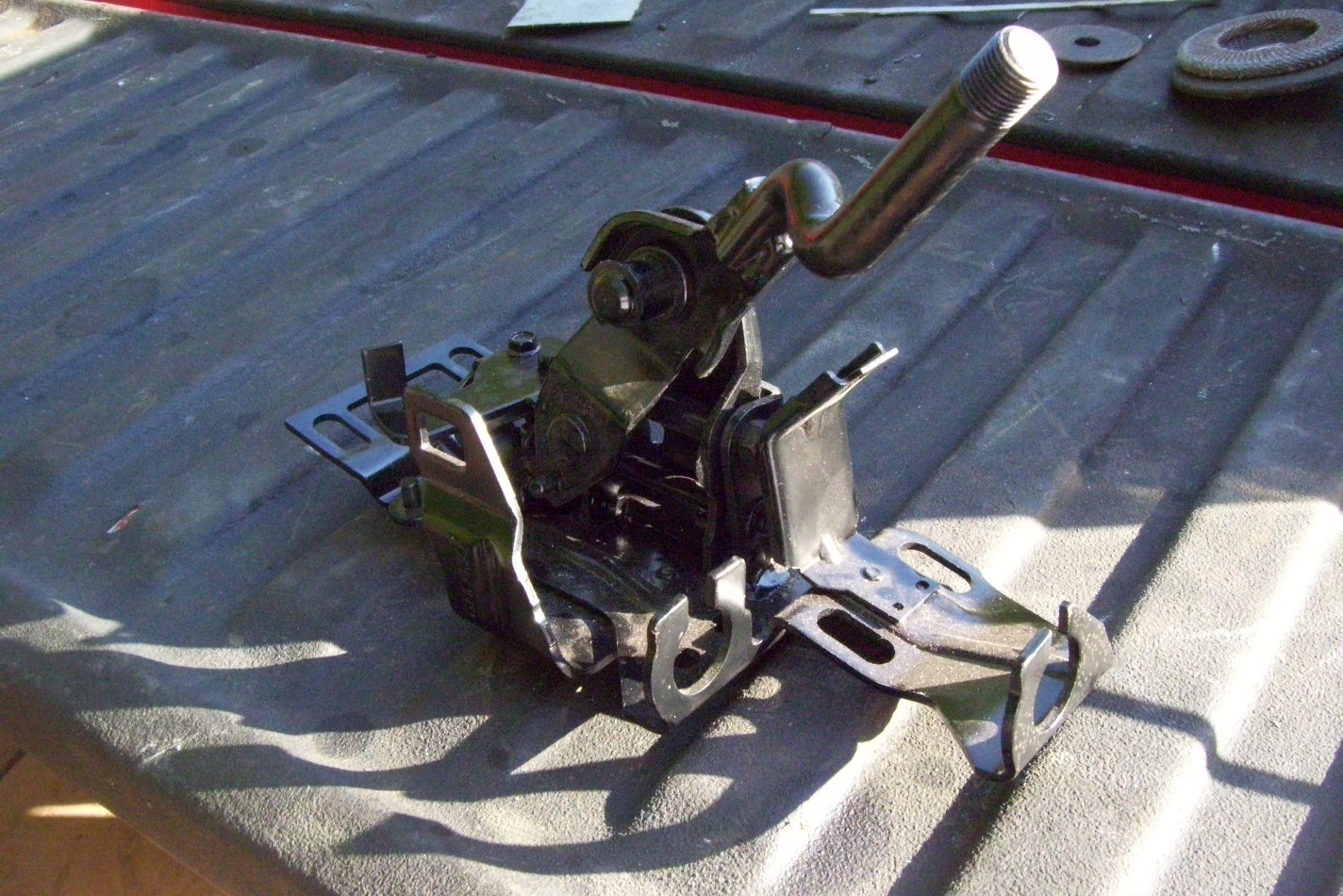 I have decided to move the shifter rearward to a more comfortable position. The original hole will get filled. My Jegs pistol grip screwed right on the shifter. When all said and done I will have less than $100 into this project. All parts come from Ebay, Home Depot and Pick-N-Pull. |