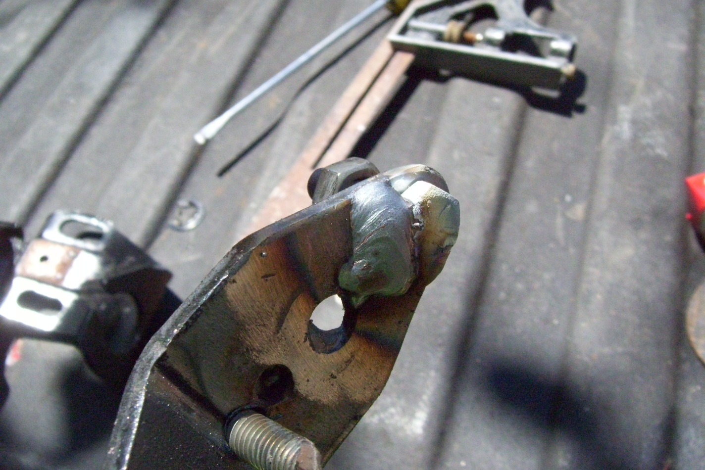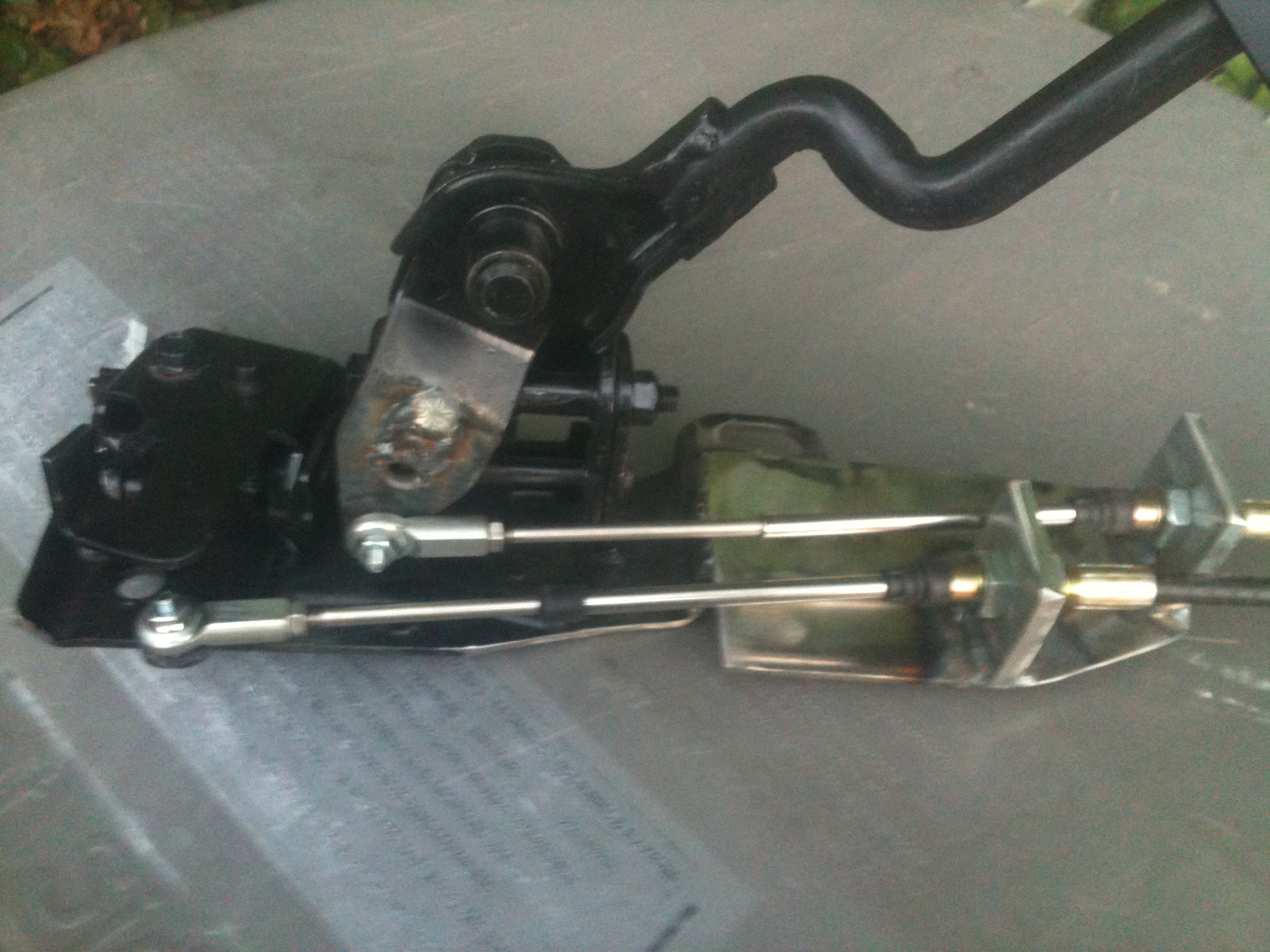 The shifter needed some minor tweeks too. first was excess brackets. I had to adjust the fore/aft stroke to 3.5"(3" is needed at the console), this was accomplished by removing the stock pin and welding in a bolt. This changed the geometry of the stop. Next I drilled out the cotter pin cable attachment and welded in a bolt. This is because the heim joints are thicker than the original pins would allow. Now I have to wait for the cables to show up. I ordered one 6' and one 7'. More to come... |