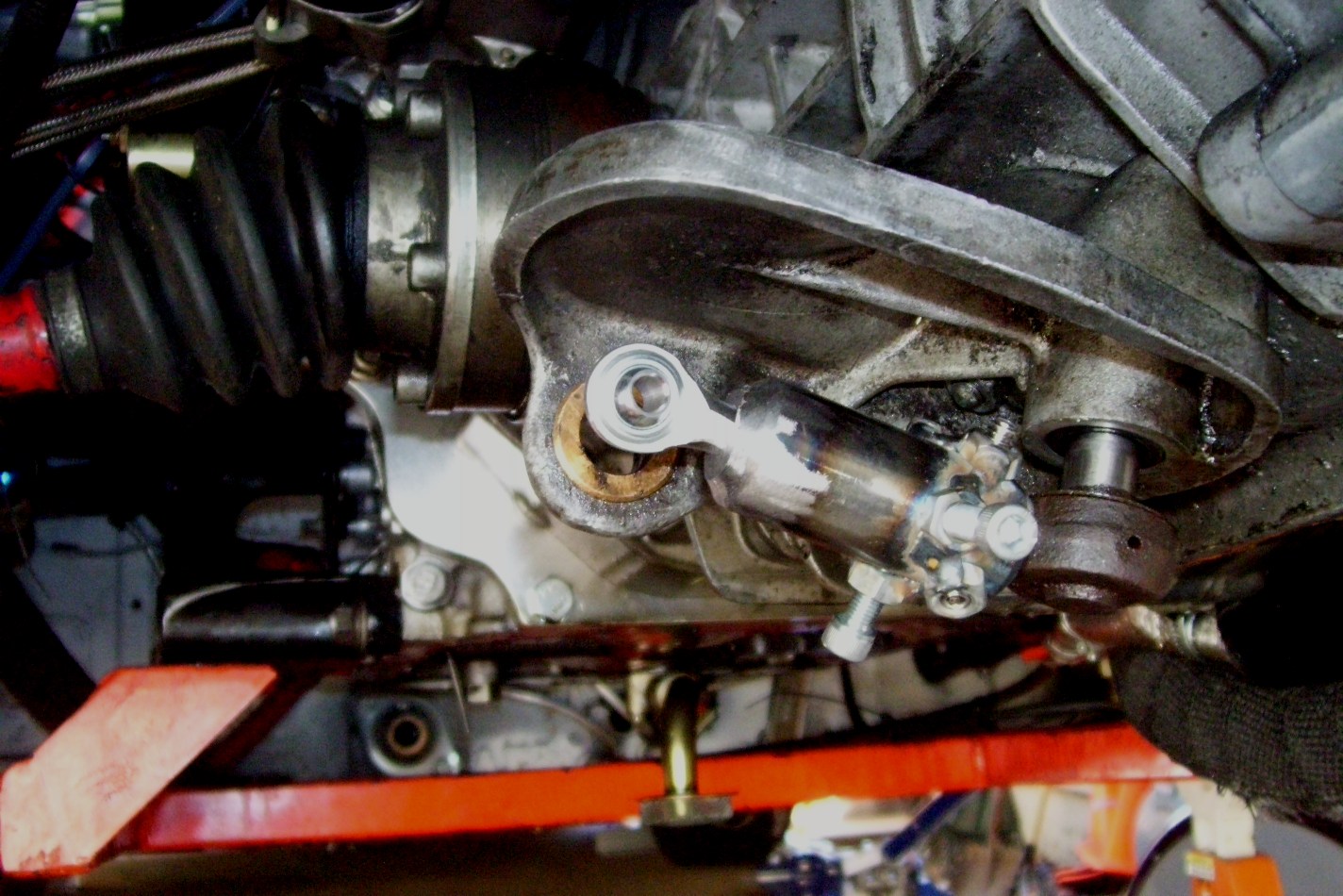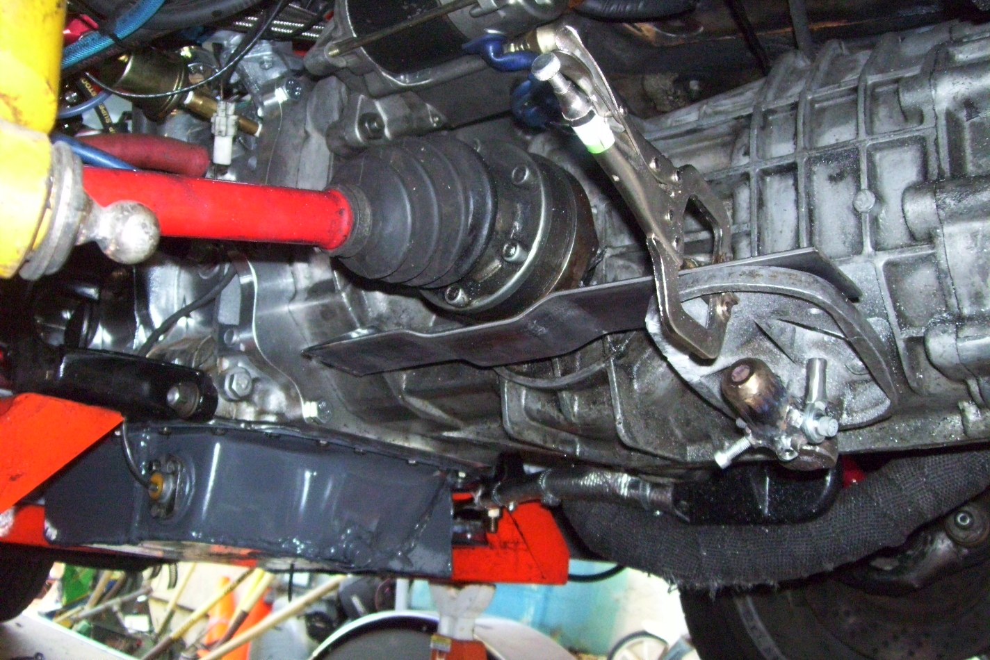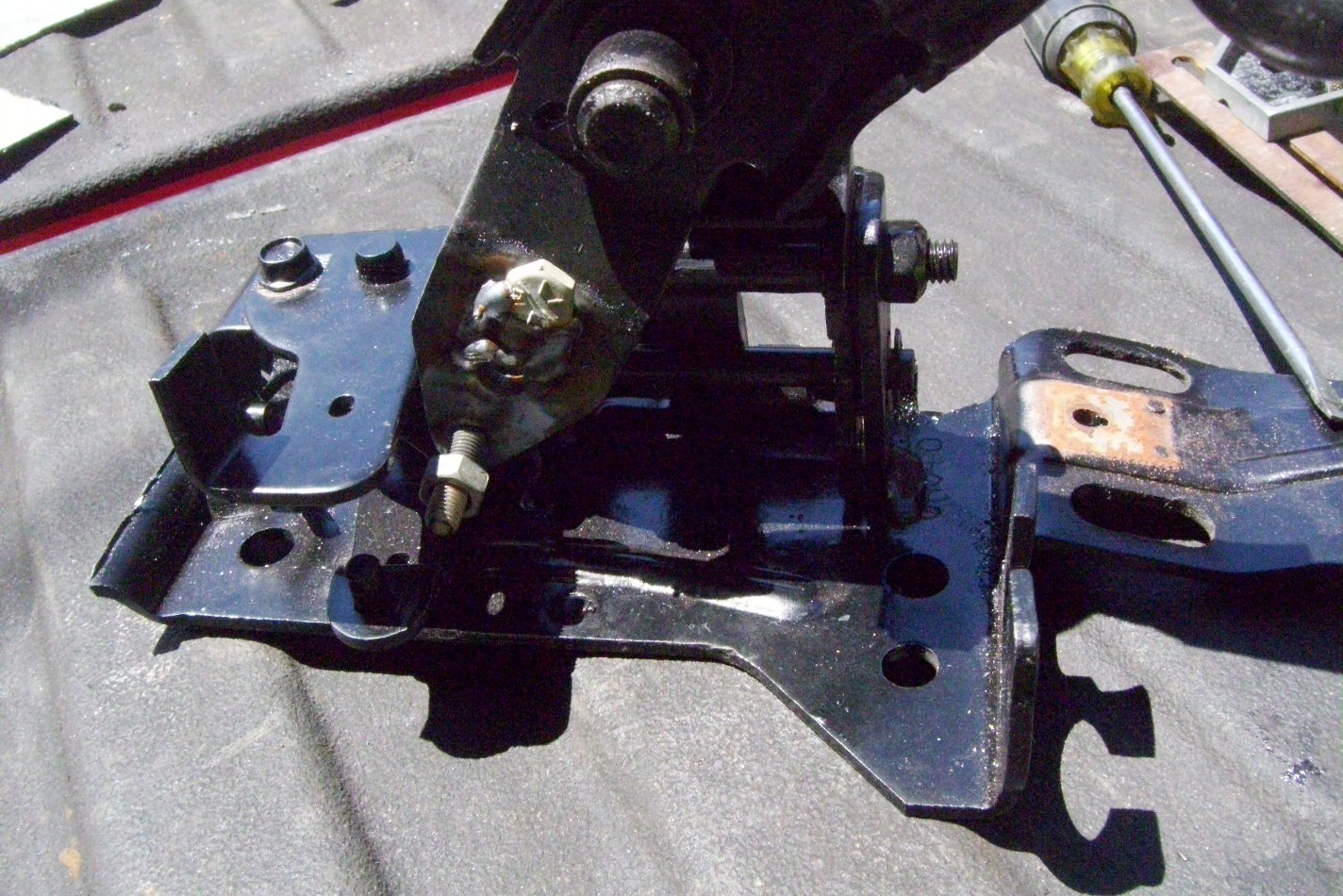 I had a little bit of time today. Started working on the bracket. I tried to make it simple and reproduceable. Not that I'm going to make more, but if you want to try, it not that hard. I made a tang to mount on the lower tranny mount. The main piece is some 2" flat stock (H.D. $8). I bent an offset to get some clearance from the CV. The rear will mount to the shift console. One of the ball/pinch bolts will double as the up/down heim connection. I machined out an opening in the top of the console for the heim. It's important to keep the heim as clost to the pivot point to avoid a large swing of the cable. The fore/aft heim will be final welded when the cables arrive. As will the cable brackets. The up/down bracket will weld to the main piece. I will use L channel vertically with a horizontal tang to hold the cable at elevation. The main piece is on the same plane as the top of the shift console, so it is not exactly level to the ground. Although I'm not a fan of cutting the console, I did. I needed to clearance for the cables.