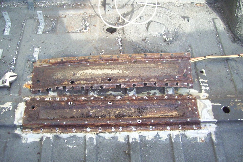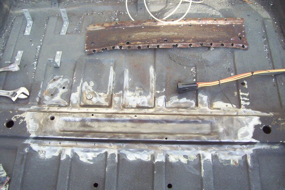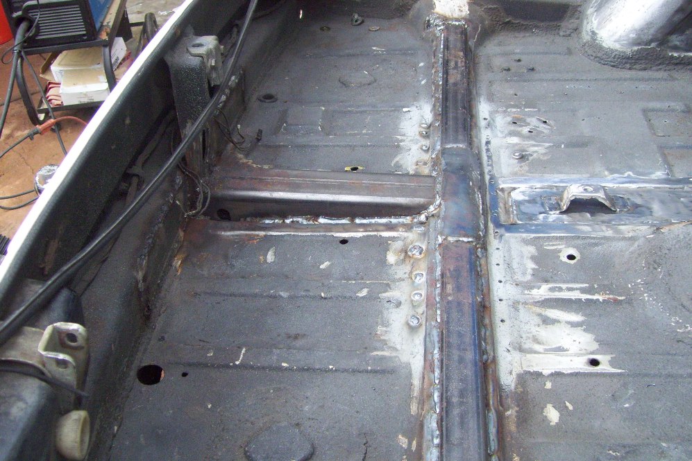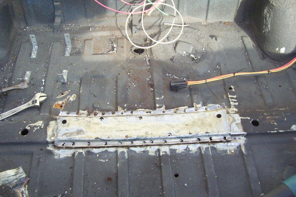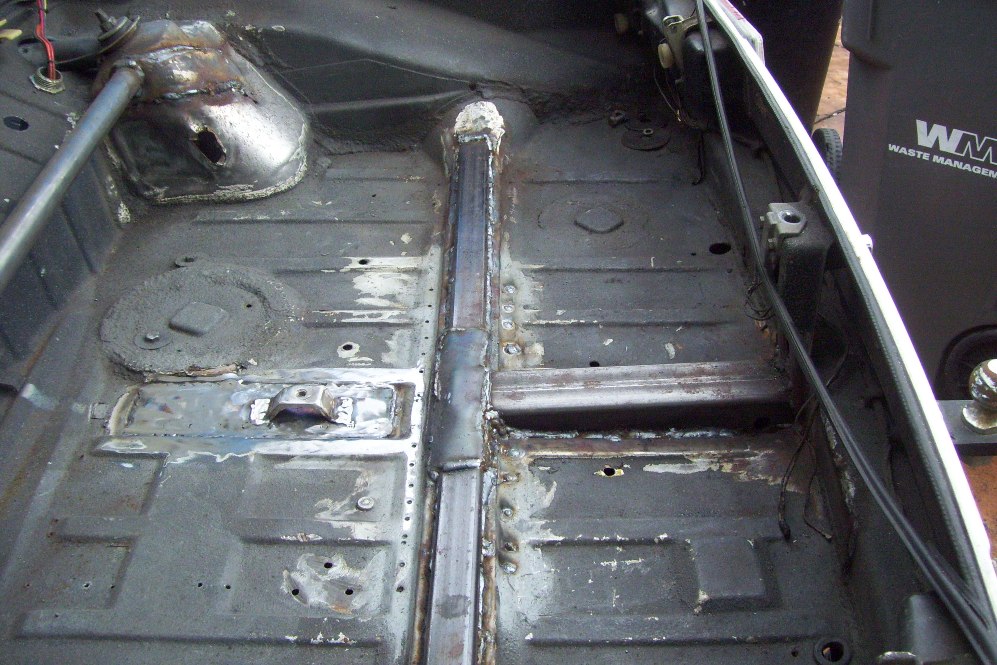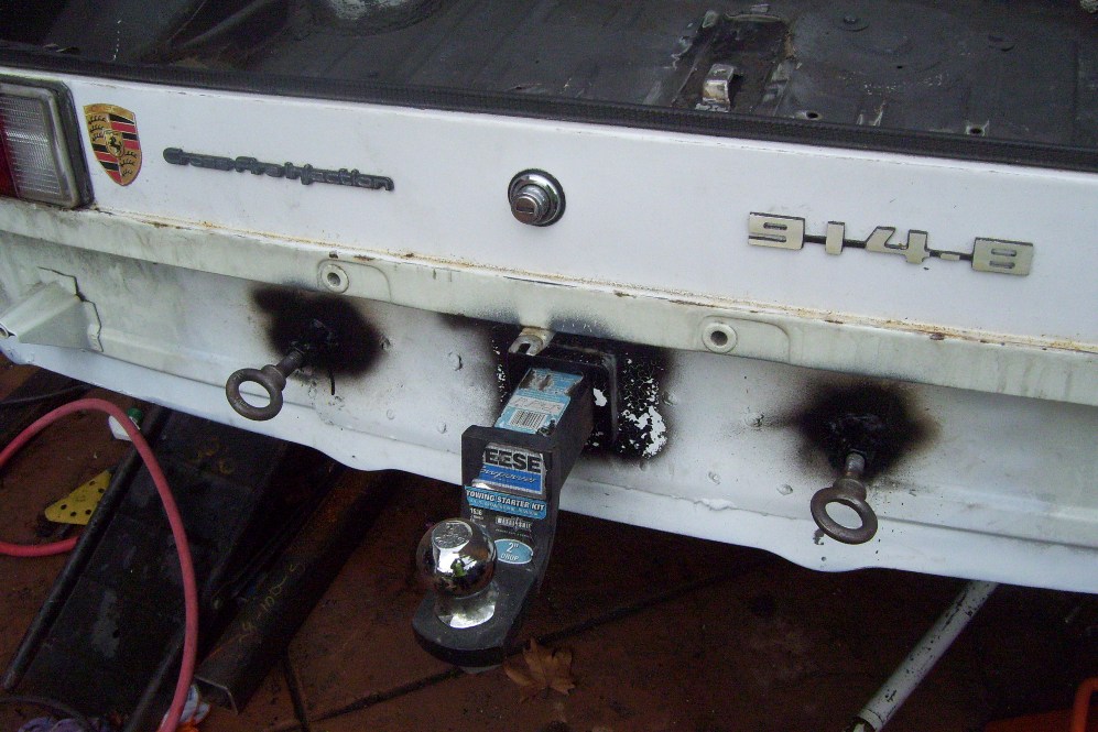 I have also been working on my trailer hitch. I took inspiration from Majkos and the car-b-que. I welded in the receiver tube. The transmission brace now has some 1.25, 0.120 wall square tubing to re-enforce the brace. Some 1/8 plate ties the two together. I drilled some holes in the bottom of the trans brace to weld some plugs on the underside. I also welded some 1/8 plate to the rear bulkhead. I welded the receiver to this and added some screw in eye bolts to tow from. The whold thing is beefy and solid. It all hides under my spring loaded license plate holder. I welded some 14ga to the center of the trunk to hold my spare tire bracket too. most of this work was done two weeks ago. Now I need to turn to the right tower damage. I suspect this happened during the cars racing career. The steel is super thin under the damage. I will cut a patch panel from the car in the garage.