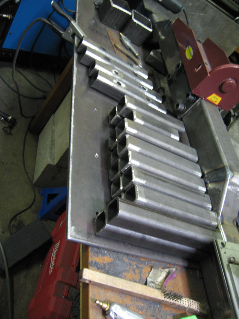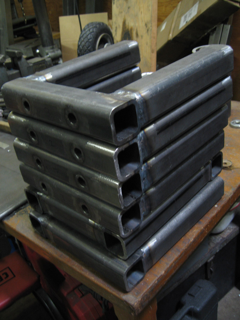 ![]() ![]() I have added adjustment for the center of gravity of the body. According to McMark, it is about an inch below the 'lip' in the front and rear. This is about 3 inches up from the line that goes through the center of the bumper mount holes. So the pivot is offset 3 inches from the beam and there is adjustability of 2 inches up and down for fine tuning. I am going up to visit Derek in Oakland, to make use of the mill at his work to form the slots. C-notched (IMG:style_emoticons/default/biggrin.gif) -root pass here ![]() Through pipes welded in. I turned these on the lathe, .770+/-.005 inch ID ![]() I am trying to finish the support beams smooth, with grinding wheel flush and flap disk smooth. Currently out of disks. ![]() Caps fusion welded, and caster plates welded with just the root pass so far. Working on the cable hoist mounts, my "cages". Mocked up and part tacked ![]() The cut material. Welding the through tubes there. Bevel-ground and mill scale sanded. (IMG:style_emoticons/default/welder.gif) The stands tacked ![]() Enlarged the 7/16 nut-serts in the mounting plates ![]() to 5/8 square weld nuts and now out of argon (IMG:style_emoticons/default/smoke.gif) I need to do the sliders to do the verticals (holes, tubes, diagonals, flanges). coming along, I guess. (IMG:style_emoticons/default/biggrin.gif) Attached image(s)