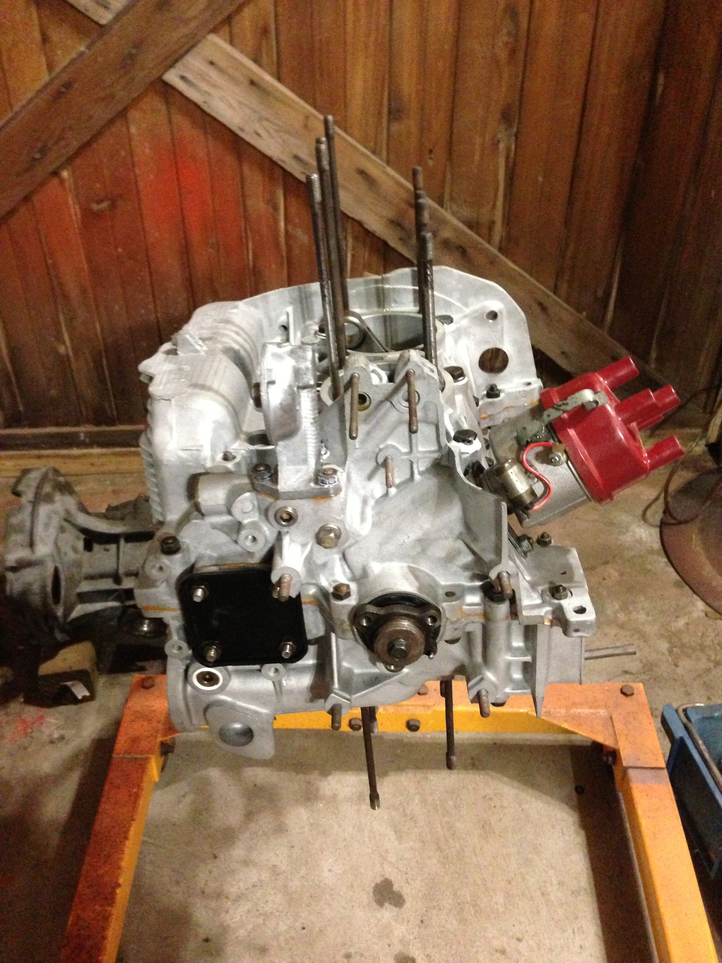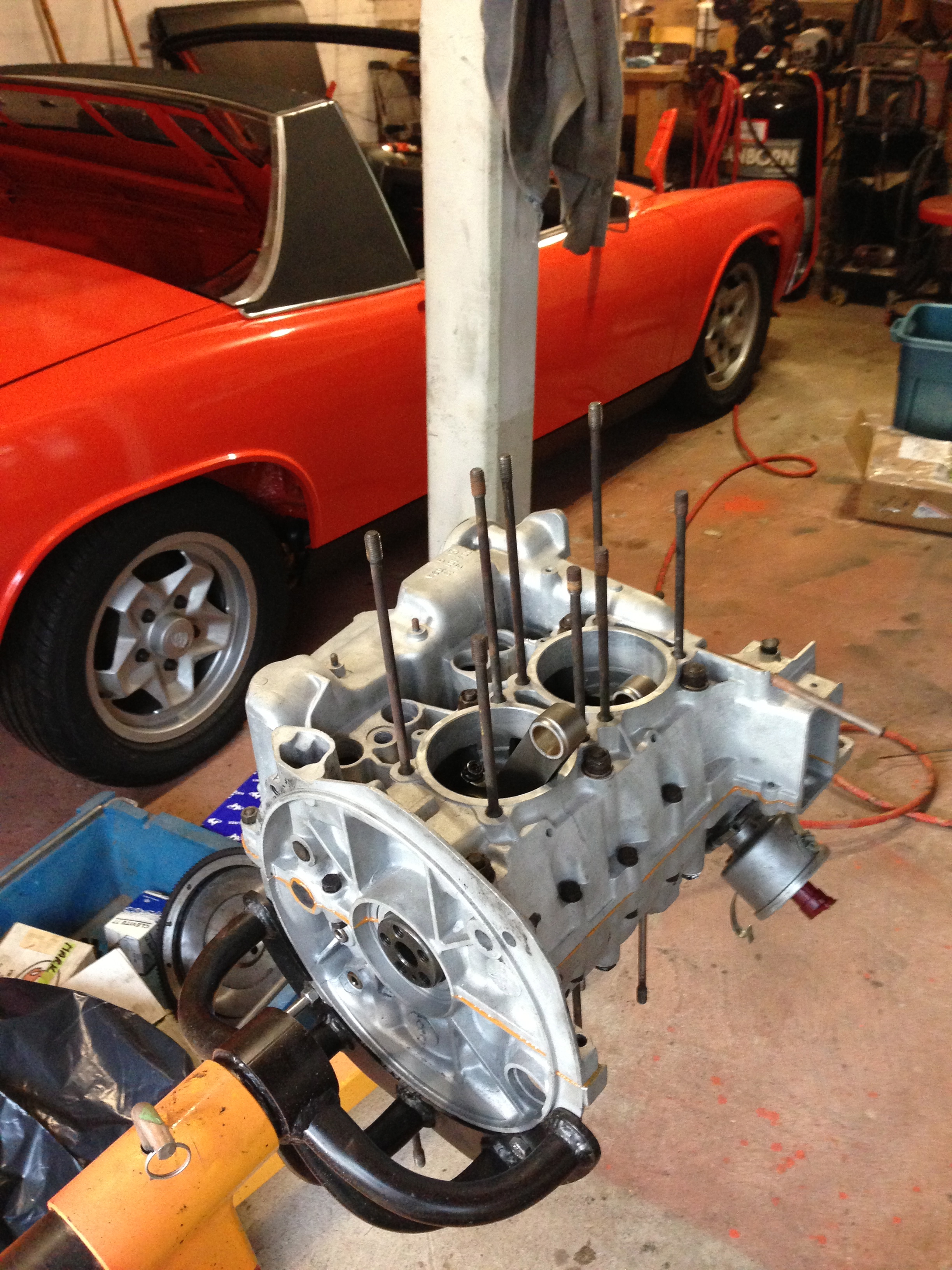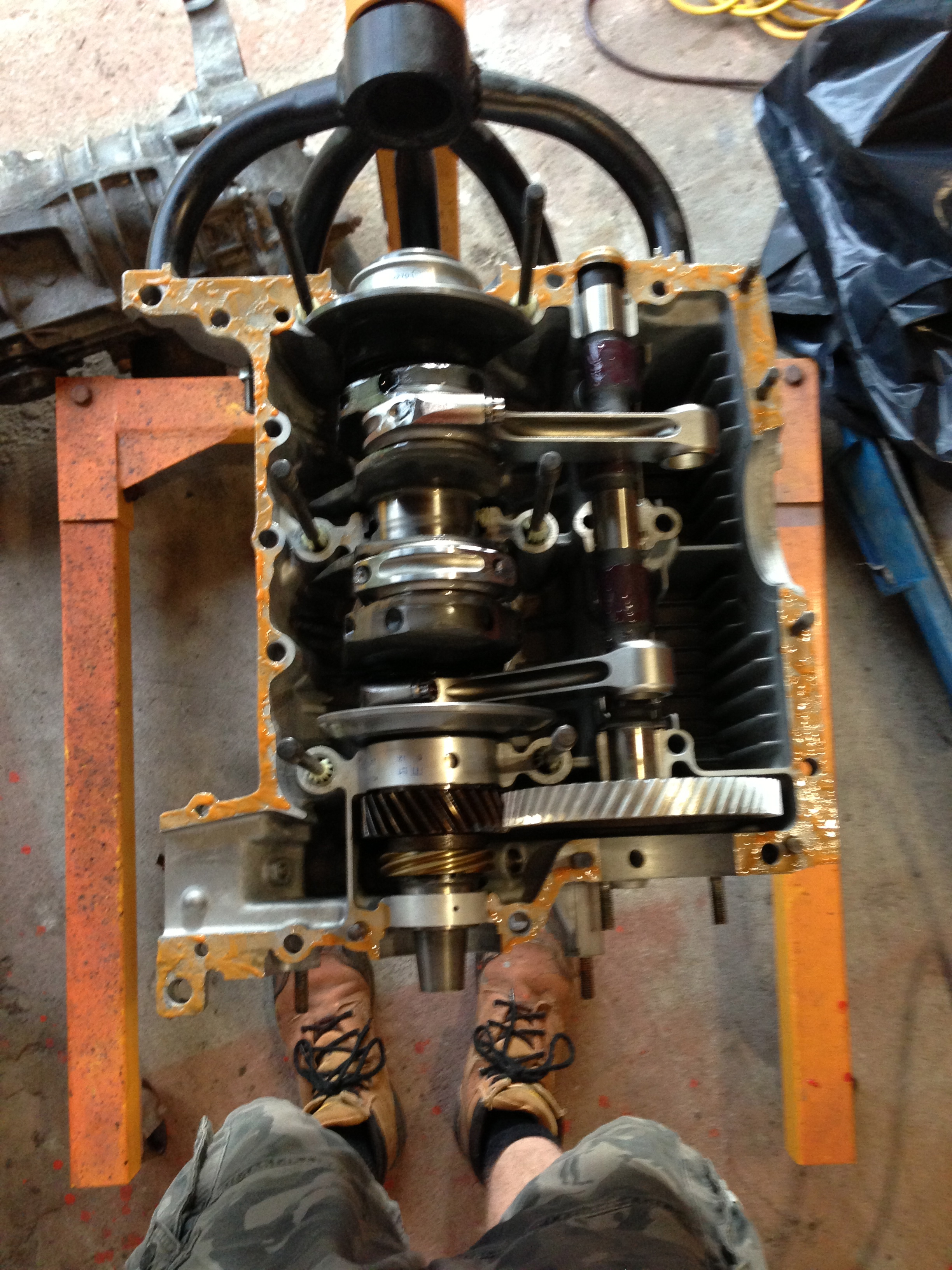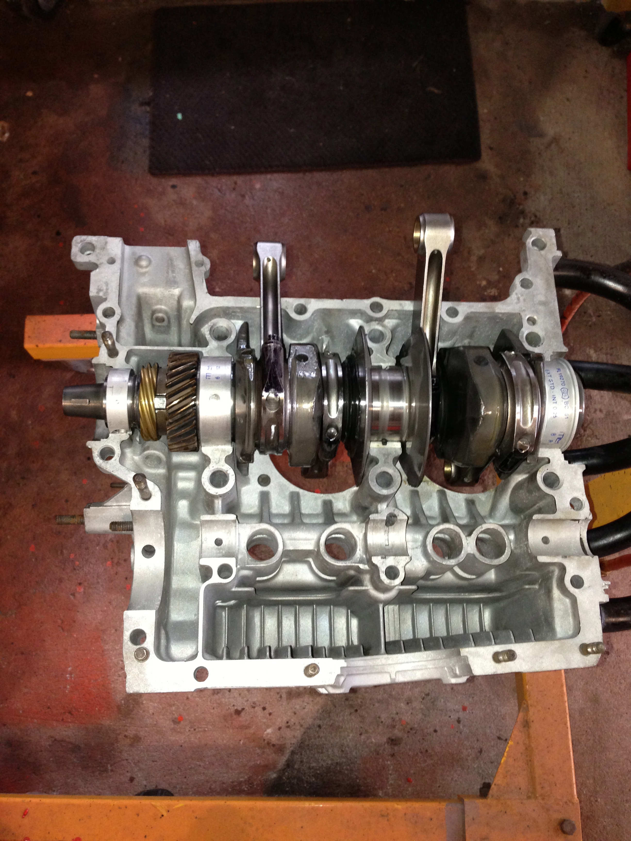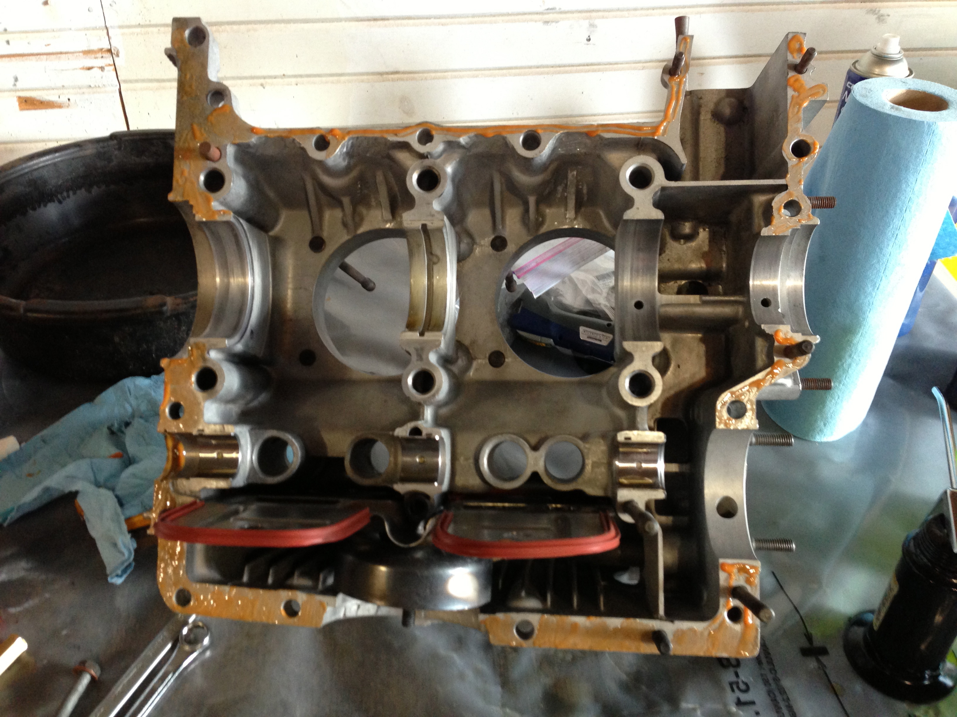 Tadddaaahhhh! Shortblock. I have some new hardware in the mail, so I just put the old stuff on there (grease, dirt n all ) so I could clamp down the case before the sealant set-up..