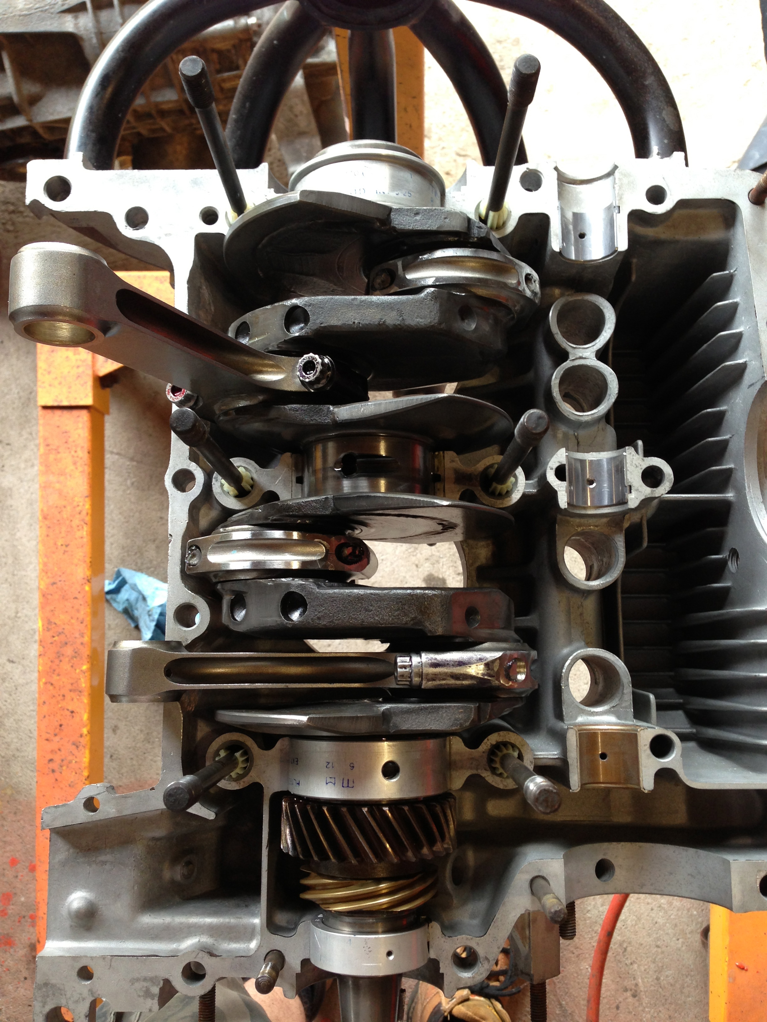 Another few hours on the engine today... put all the studs back into the engine case halfs. Got the crank gears onto the crankshaft and put the crank into the case.. spins nice a free...