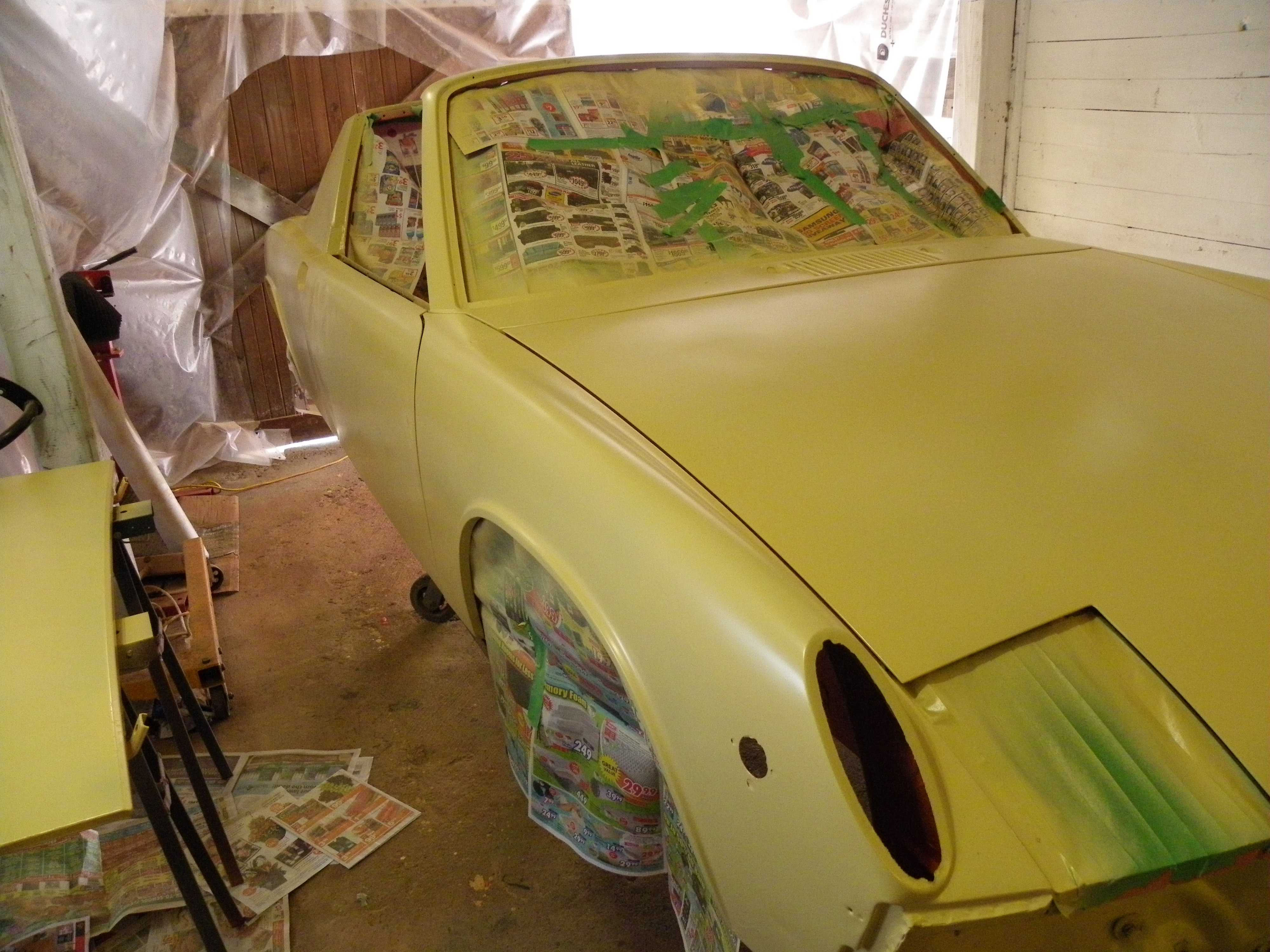The filler I had to put on the door and a couple small spots didn't turn out as good as I'd hoped.. I've heard someone say " its just like mudding drywall " and well I hate doing that and I suck at it too... So I'm a bit disapointed in how the filler turned out.. BUT I'm not looking for a perfect concours car and I knew already that I'd be getting another ( professional this time ) paint job done in a couple years.. I just need the car back to one colour and welded up so I can assemble it... The paint on the other hand turned out pretty good for a first timer with no training to speak of... I have a couple runs to sand/buff out once my dry time is up. Considering I painted in my garage, with vapour barrier walls and ceiling and a big fan to create negative pressure and poor lighting, I think it turned out decent.. True test will be tomorrow when I pull it out of the garage into the sunlight... Attached thumbnail(s) |