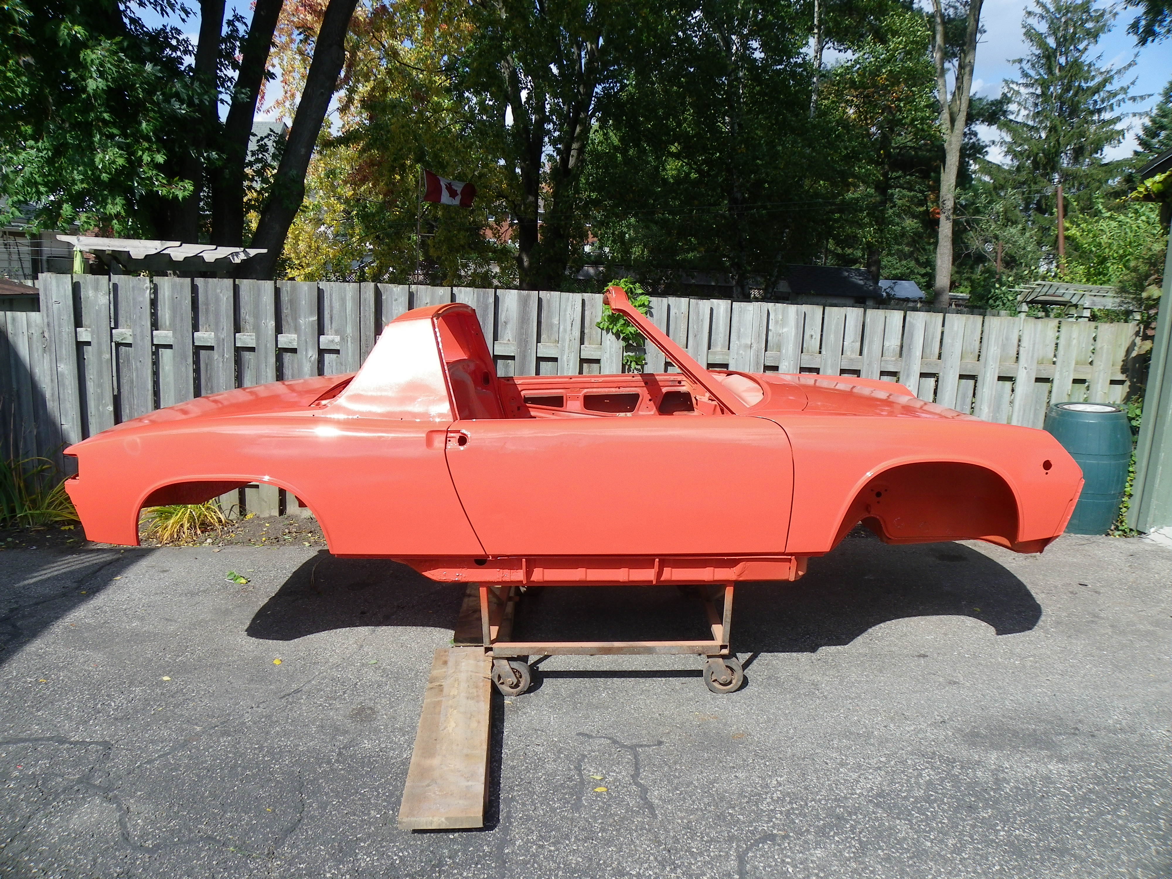 draged it outside and pulled off the masking, etc.. Well I wanted a 10 ft paint job and I'd say thats what i got.. I still want to repaint the left rear quarter, but I think we've run out of warm days for the year and its getting cold at night, so it will have to wait untill next spring.. I'm starting to now order parts for the suspension to get that all hung... More to come in a week or two. (IMG:style_emoticons/default/beerchug.gif)