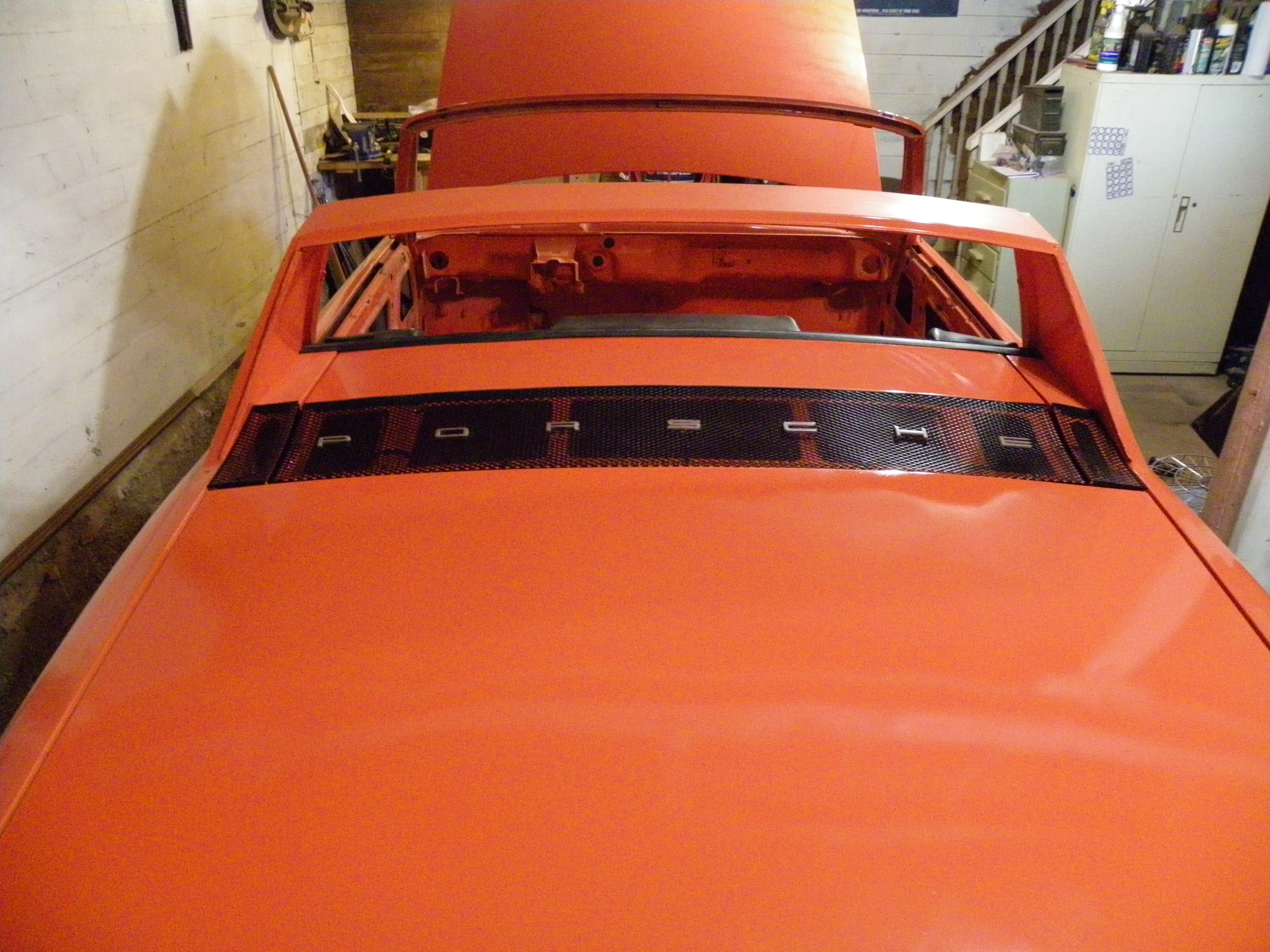 I got the engine grill back together and the broken letters replaced and put it back on the car temporarily. I'll have to take it off when its time to put the engine in ofcourse. Put the front hood springs back on and both trunk lids.