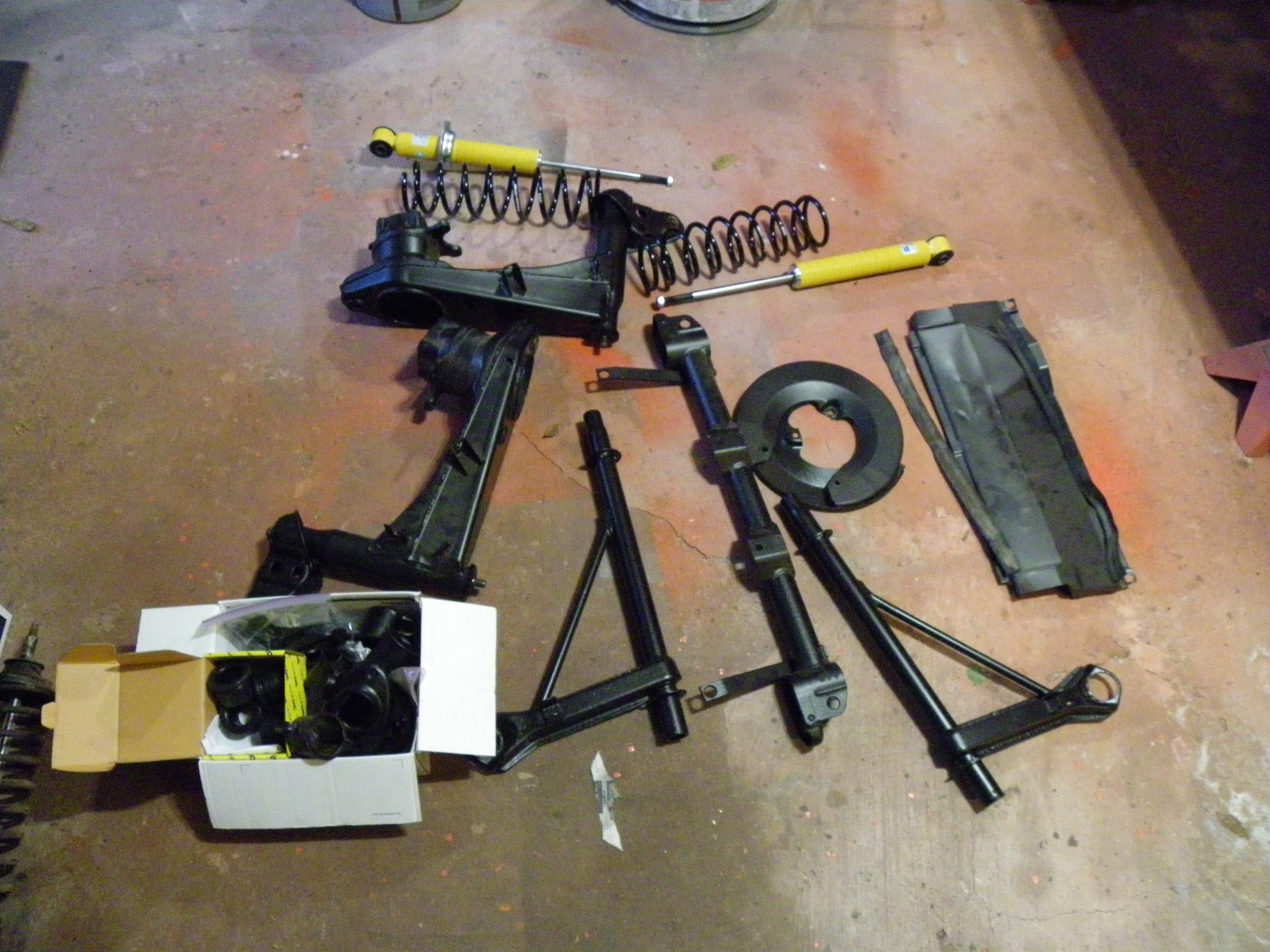Also pulled down my suspension parts from the barn and got in new bushings from Eric. Big thing was that the car is back off the dolly for good now. Back sitting on jack stands so that I can start assembly. Attached thumbnail(s) |