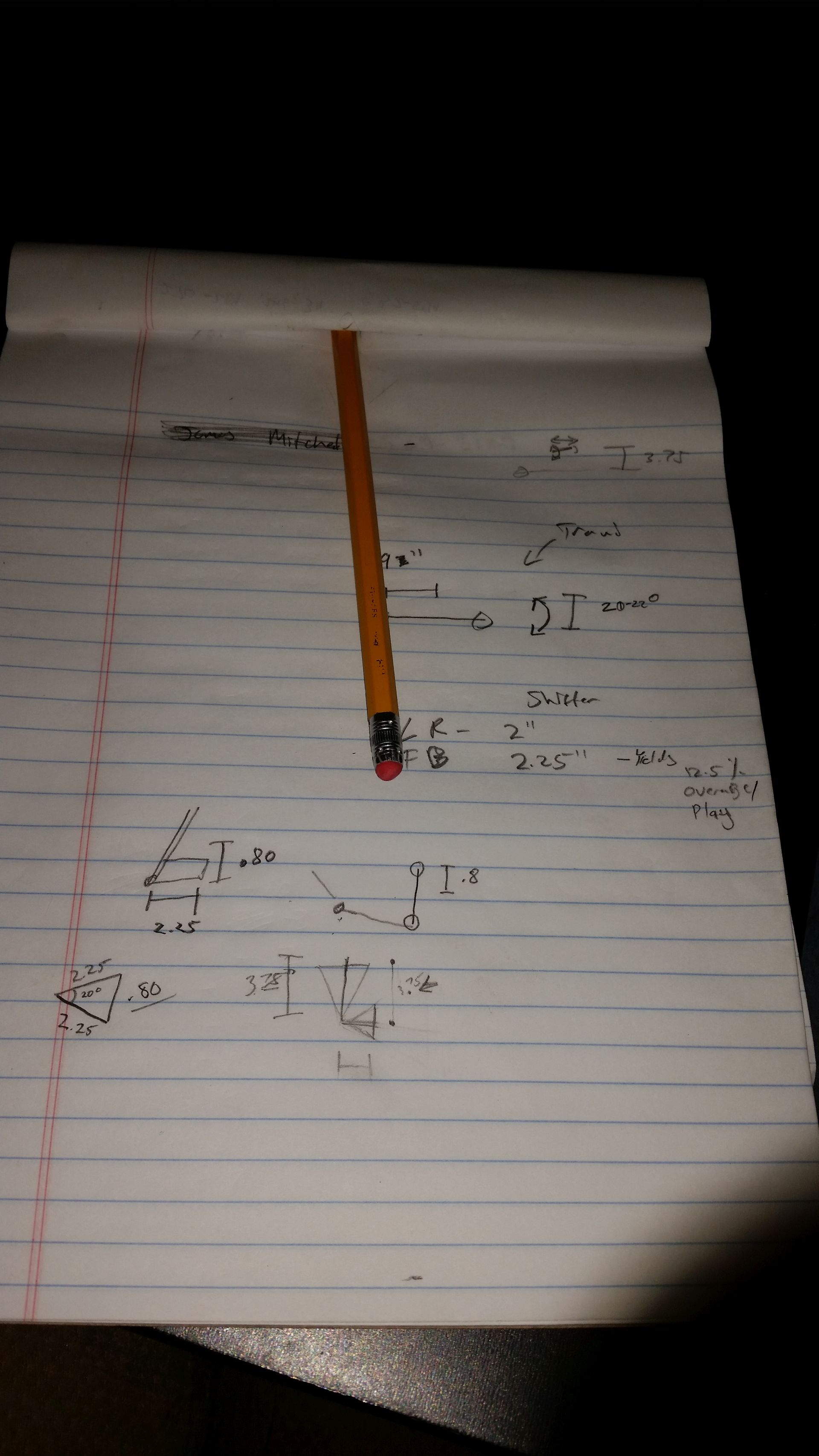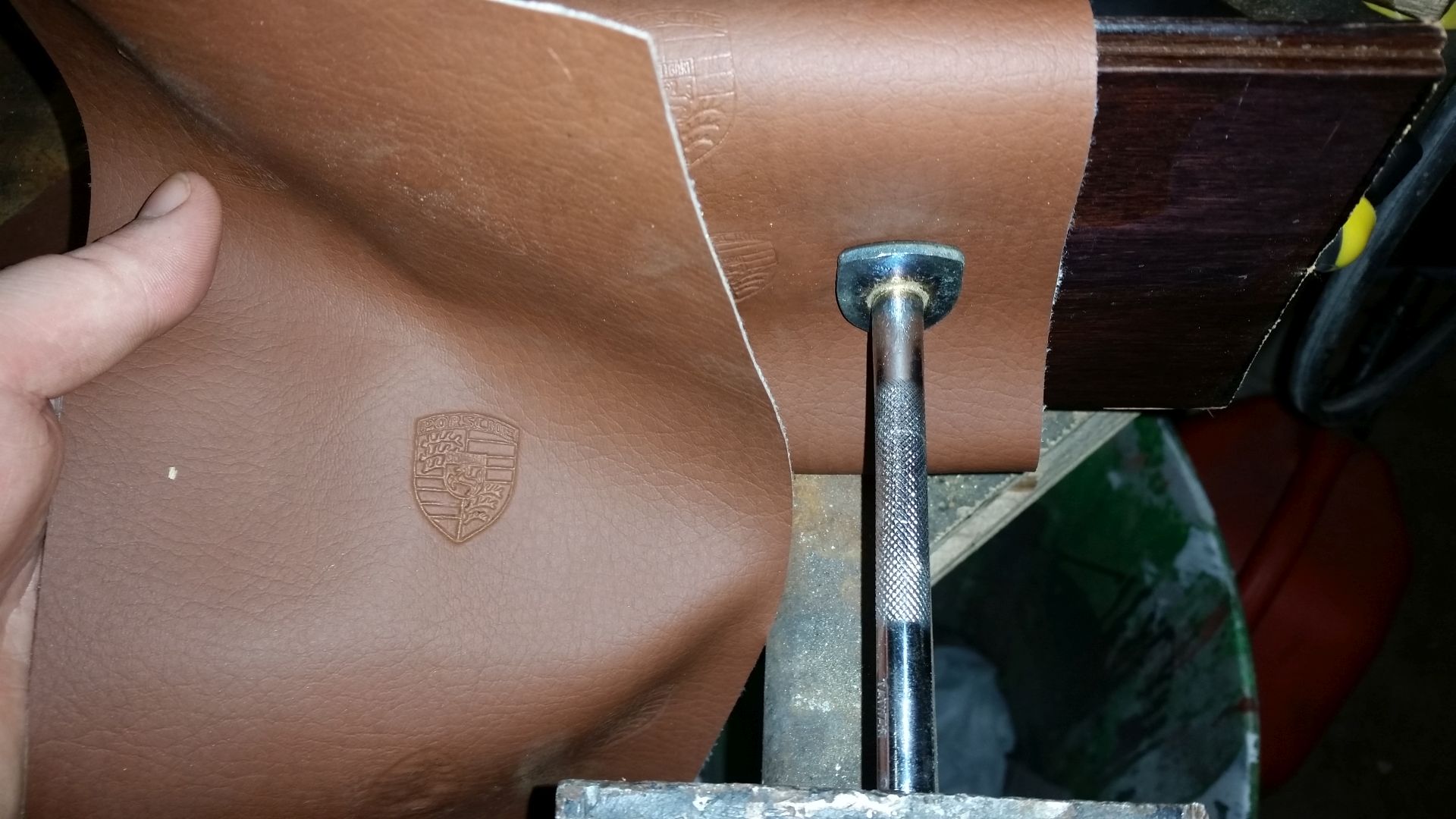 The main pivot that I used was a timing belt idle pulley. I planned on buying a new one and this fit the bill really nicely! Most of it was made from flat stock, the bit that goes around the trans shaft was the most difficult as after 3 times going to the steel shop I got the wrong diameter... In the end I settled on doing what Mike did and have it bolt tighten vs just a slip tighten. You can see there is a lot of extra metal on the setup and it will be trimmed off after all is said and done. What is left is fabricating the brackets to hold the cables in place then to test the system and adjust. My bench testing shows that it seems to work just fine, The linkage moves a bit more than necessary to find reverse, but I dont really see that as a long term issue. I did some maths to figure out angles and lengths... Its interesting that my setup is so much different than Mikes. in terms of lengths and angles. I highly doubt there will be much if any difference in feel. Oh and a fun toy (IMG:style_emoticons/default/smile.gif) I hope I dont go overboard with this... But I plan to hide little Porsche crest everywhere, and a couple obvious one's in the headrests. If anyone wants me to imprint any leather or vinyl PM me. Its fairly small.. |