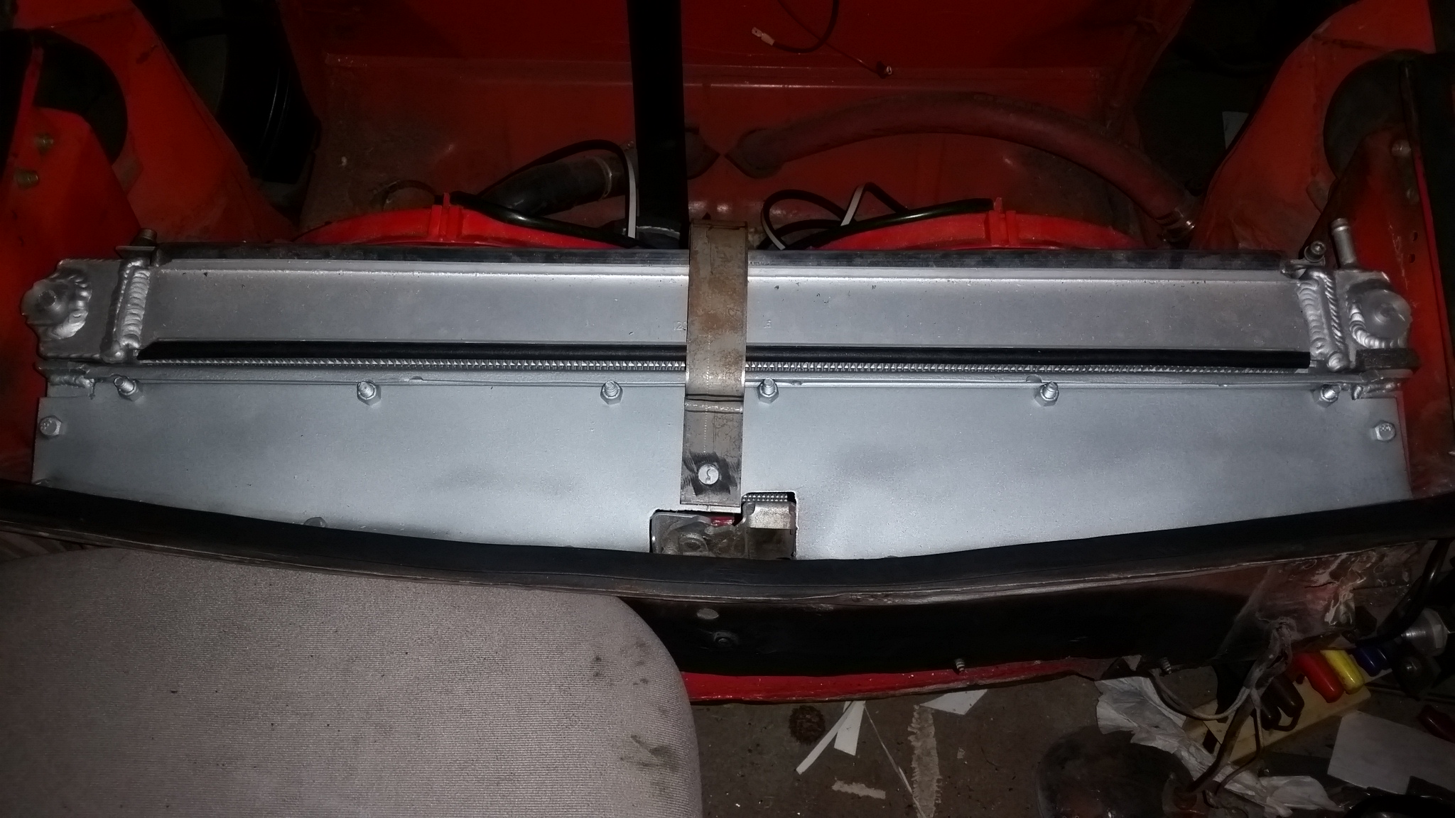 Finally the upper section is built. The vertical radiator supports are joined by another piece of 5/8x5/8 U channel steel (glass stop). for the radiator to sit on. We have some bulb seal on the radiator and some foam seal on the radiator support. Vertical gaps are taken up with foam seal (weatherstripping). The upper section is more 16ga steel and I am debating on tack welding it, but I most likely will bolt it down with bulb seal underneath. Vertical gaps have not been taken into account yet as I havent bought my AC condenser yet. And I am testing with using the strap in the middle to hold everything down or build straps on each side that connect to the factory mount tabs that I hacked off a bit to much. Still more thinking to do here. |