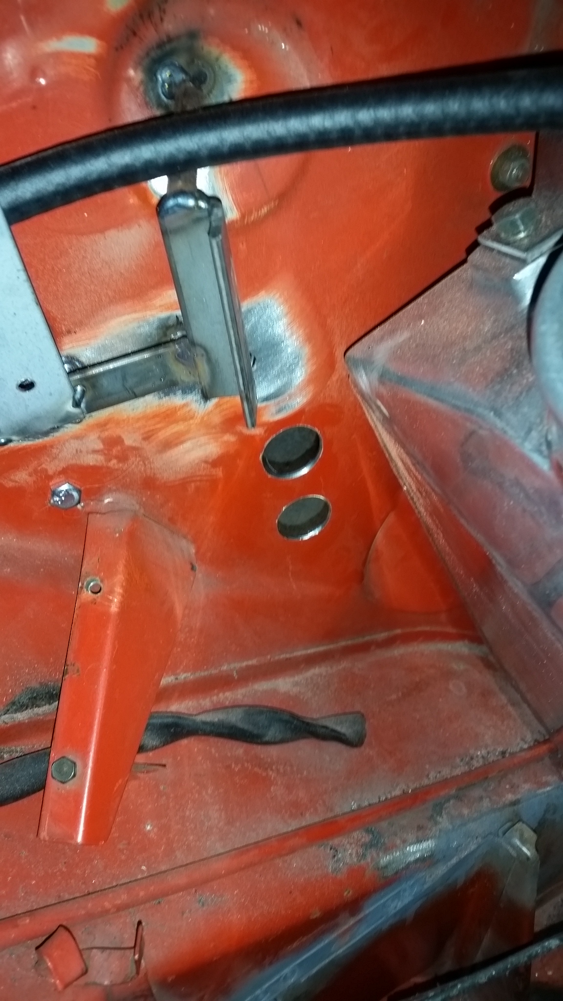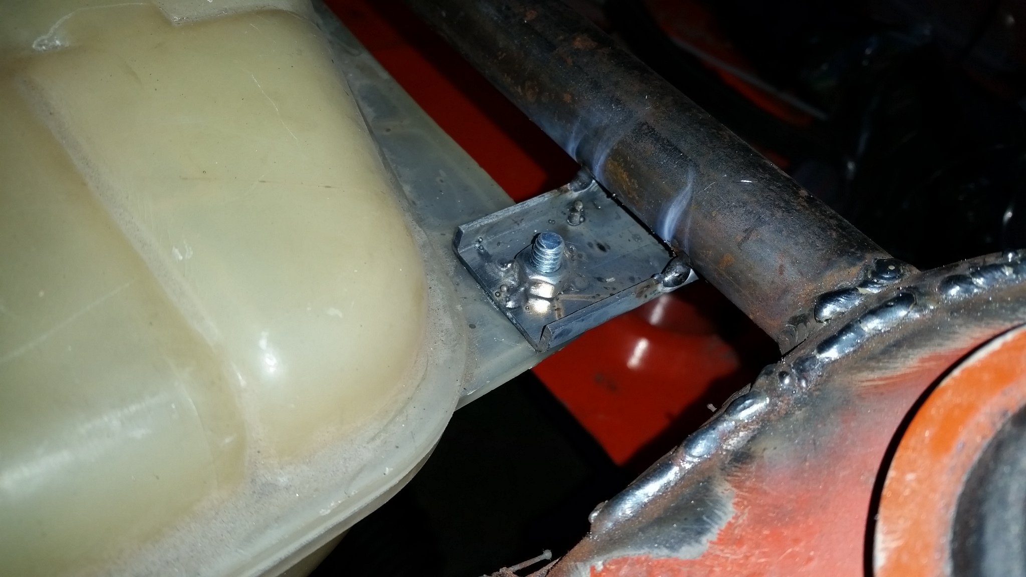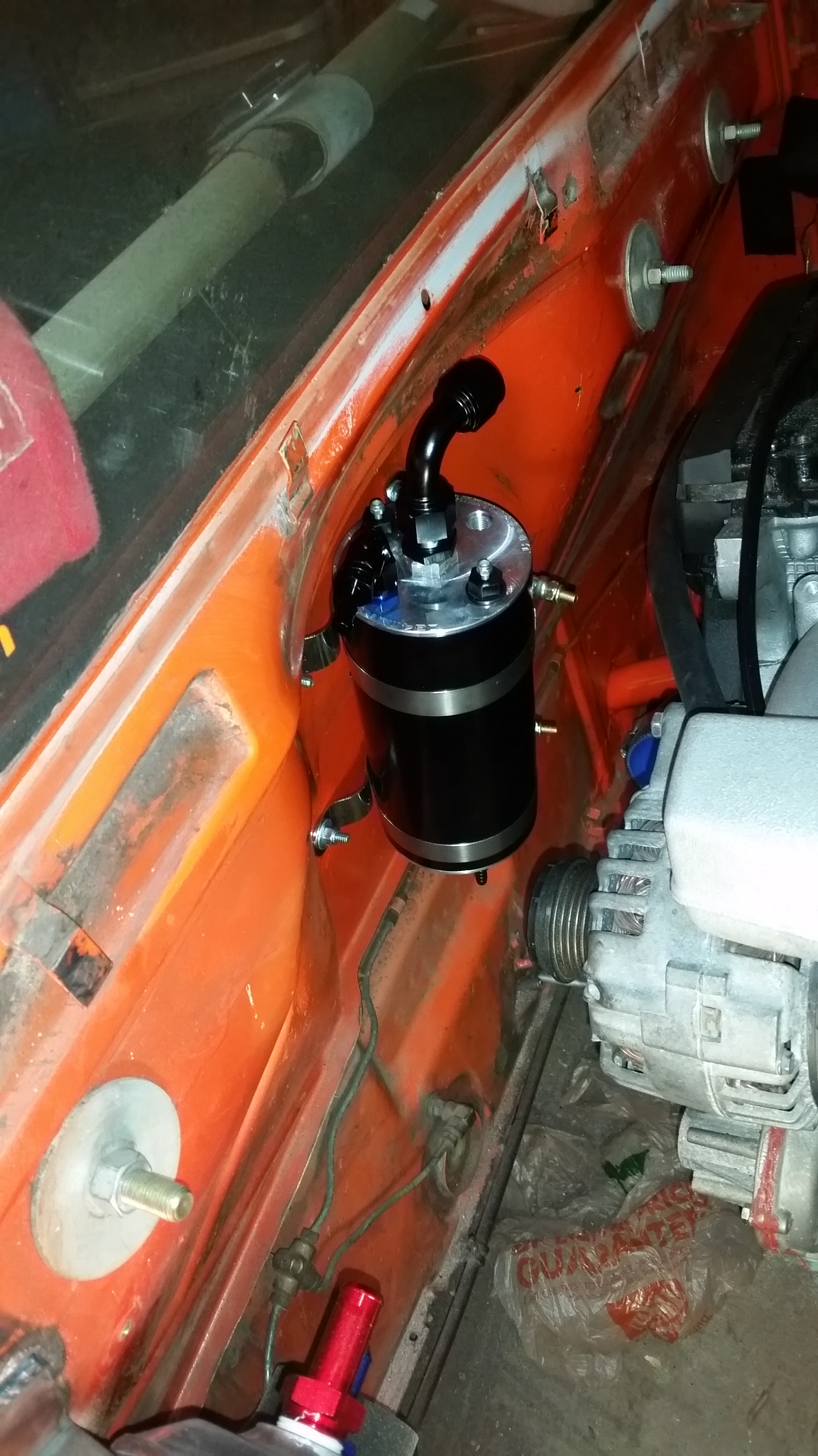 Welded in brackets for the coolant reservoir My AN lines and fittings came in. I must say these took a LOT longer to put fittings on than I thought. It took me over 3 hours to do 4 fittings. Took the trunk off. Whats that under the bumper? (IMG:style_emoticons/default/idea.gif) |