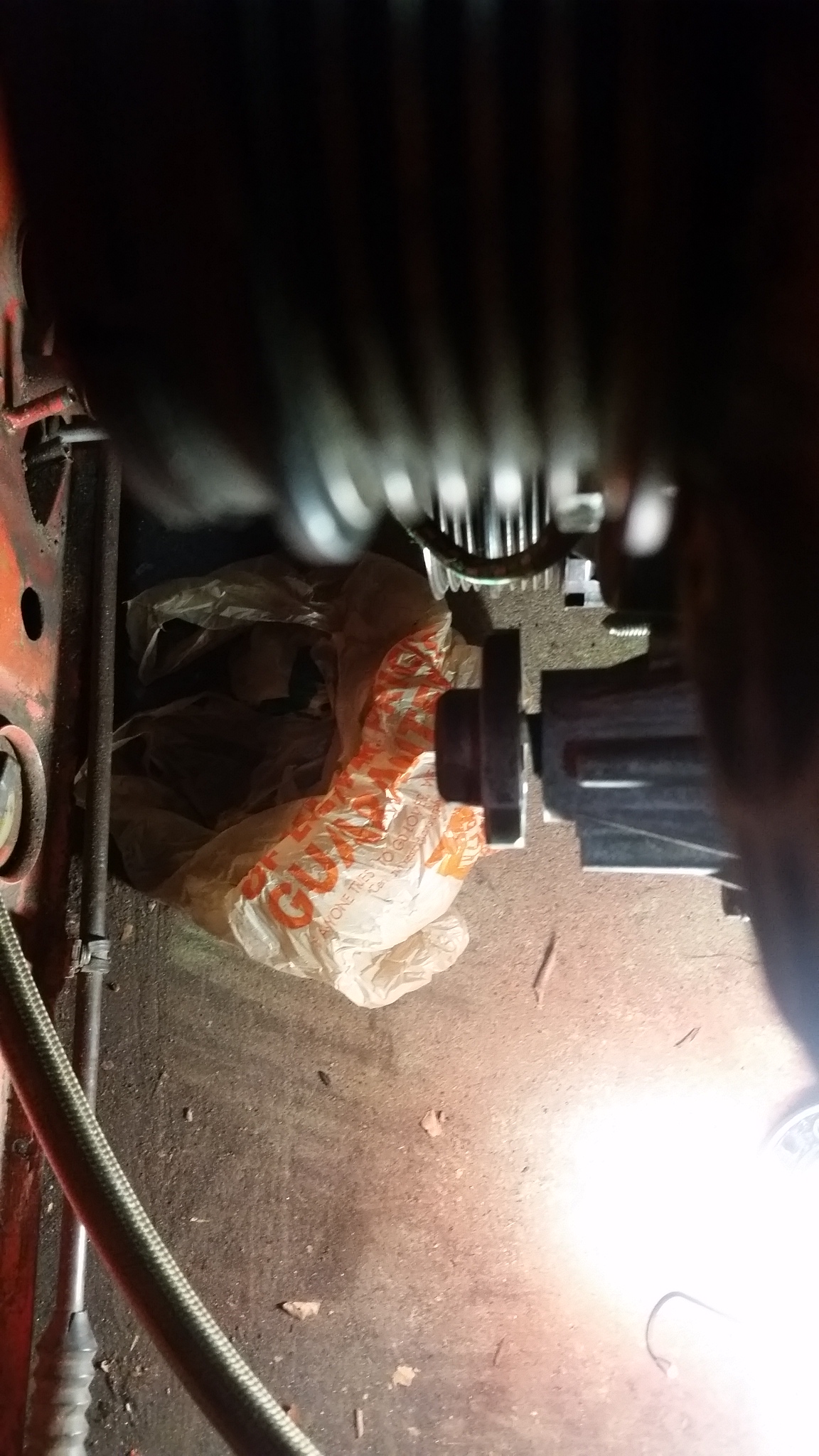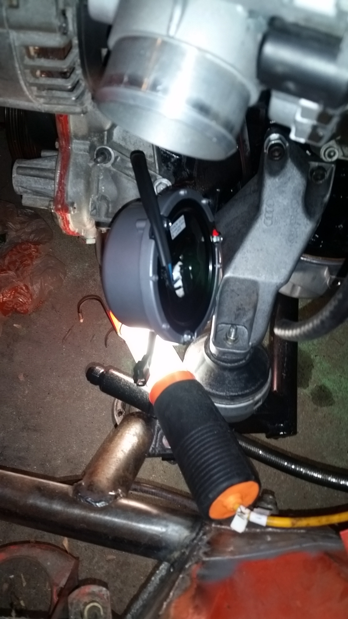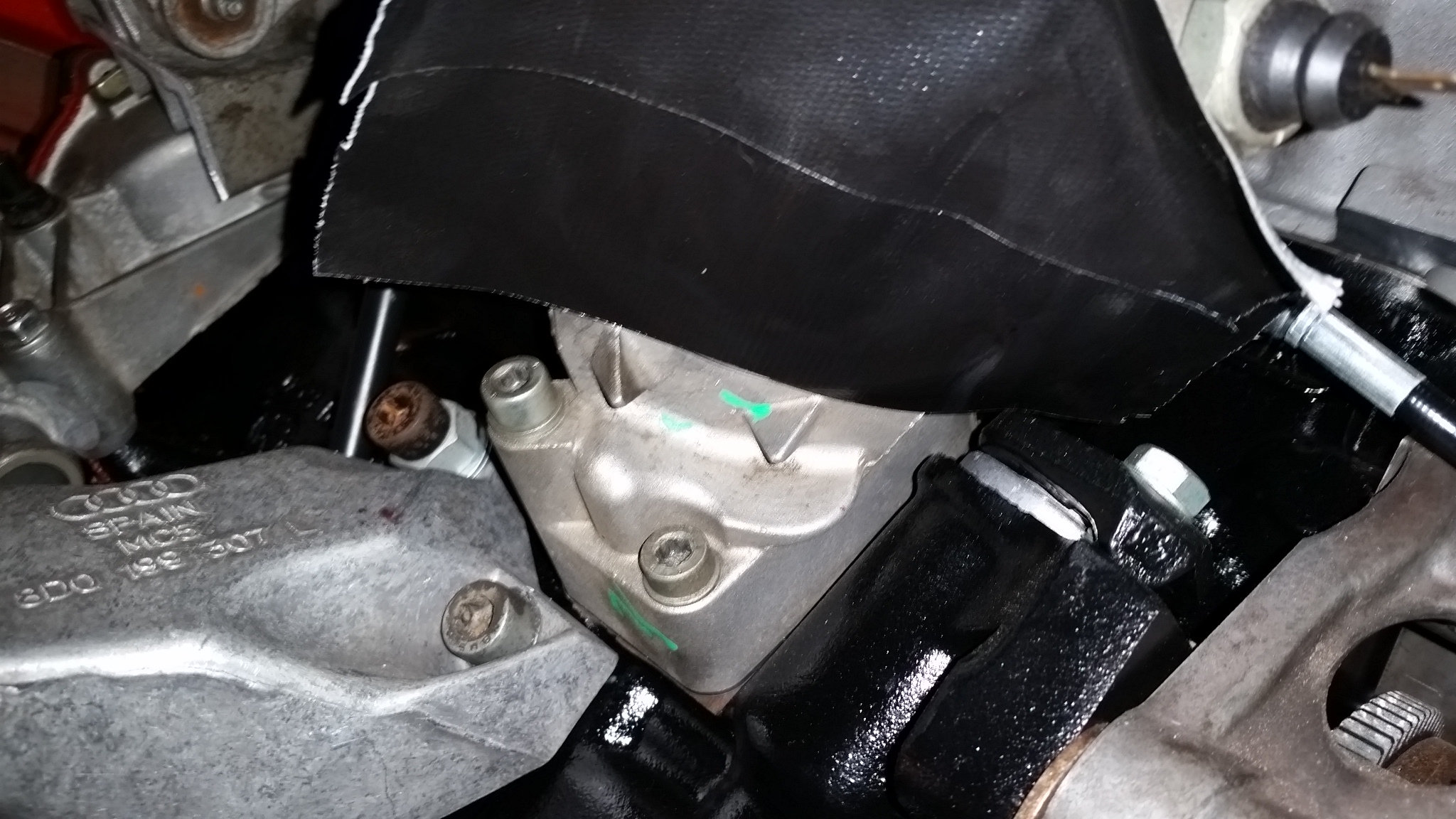 Quickly Karate chopped it in half. Only the top half is needed, the lower half has a idler pulley and the power steering pump. Both not being used. With the alternator mounted under the intake manifold you can see the gutted water pump sticking out. The pulley mount looks like it could interfere so off with its head! This nets us with about a 26 1/2" belt, I have a 27.3" belt on order, and I think it'll work just fine. I also got the extended oil tube for my S4 oil cooler (Going to run this till I decide to run the external oil cooler...). But it requires the little cat ears to be ground off the oil cooler mount. Couple minutes with the grinder and they were off. Oil cooler is installed and the oil filter installed as well, but I will probably pull it and fill it prior to starting the engine. |