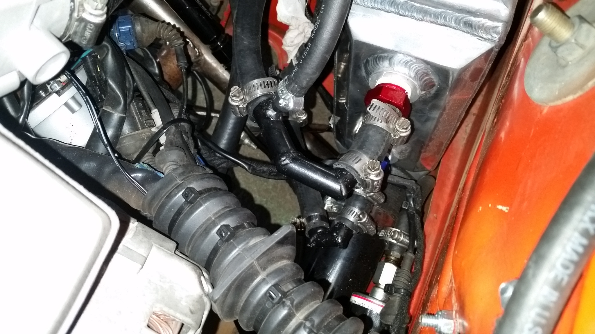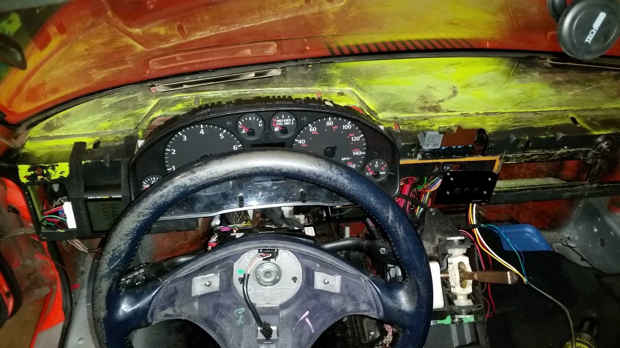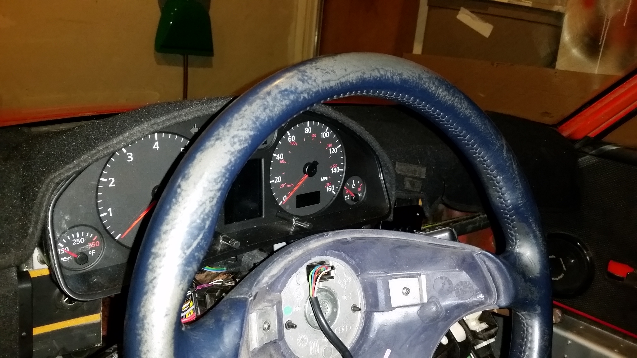 Finalized the finishing work to the motor side of things. I plumbed and setup the intercooler cooling. As I had mentioned I had been running on essentially no intercooler, which was pretty impressive that I didnt have any detonating up top at 10psi. If anything it put a good about of strain on the motor which is good, Thats how I like to break in rings (IMG:style_emoticons/default/smile.gif). I modified the stainless joiner pipes I had made so that they take account for most of the "U" turn on the radiator coolant hoses. Im happy with this decision as it makes for a cleaner engine bay as well as shorter hoses. That being said it appears as if I have one leak as well as the pump itself appears to leak a little. Im going to leave it for now and re-address it after 4 months when I pull the motor to clean things up and finish the metal work on the body firewall (I will address the oil leak at the front as well at that time and probably pull the pan and check the internals for premature wear). I wired the water pump on the Audi's factory fuel pump wire (I have a dedicated 12ga wire for the fuel pumps), so it runs when the engine runs. However I have the small 4" fan wired up to my fan controller I bought for $12. I have the temp sensor taped to the intercooler and it works pretty well this way. https://www.youtube.com/watch?v=tXcIDlWkGk0 If I needed to just have this work for say my radiator fans I would hook it up to a relay, but the amp draw on the 4" fan shouldnt necessitate that. Something for you homebrew guys to think about. This would work great for a dual fan setup running twin controllers at different temps. I currently have the fan setup for about 115degF turn on and it'll turn off at ~ 110. Its a small radiator and thus I imagine it could get hot, but on a quick test drive with a 1-2 pull I didnt even see the intercooler go up 5 degrees. It also pulled much stronger with the colder dense air. I tried all weekend and late last week for my tuner to get to work on my tune but he is responding once and then ignoring me.. I might have to go to my back ups soon. I also spent some time on the dash. I first worked on the "Mike Bellis Special" cardboard template but wanted a more solid foundation.. So I hacked up the stock dash base to fit. The stock Audi dash cluster didnt have any provisions for bolting/mounting (apart from the front 2 flimsy ones) so I opened it up, clipped the noisy alarm charm, and put some bolts in the backside. I'll grab some foam, tape, plastic, tin foil, and blades and start getting back to my "creative" side shortly. I hope to have the dash and center console completed by the time the competition is over. It would also be nice to have the rear firewall done but thats dreaming really tall.... |