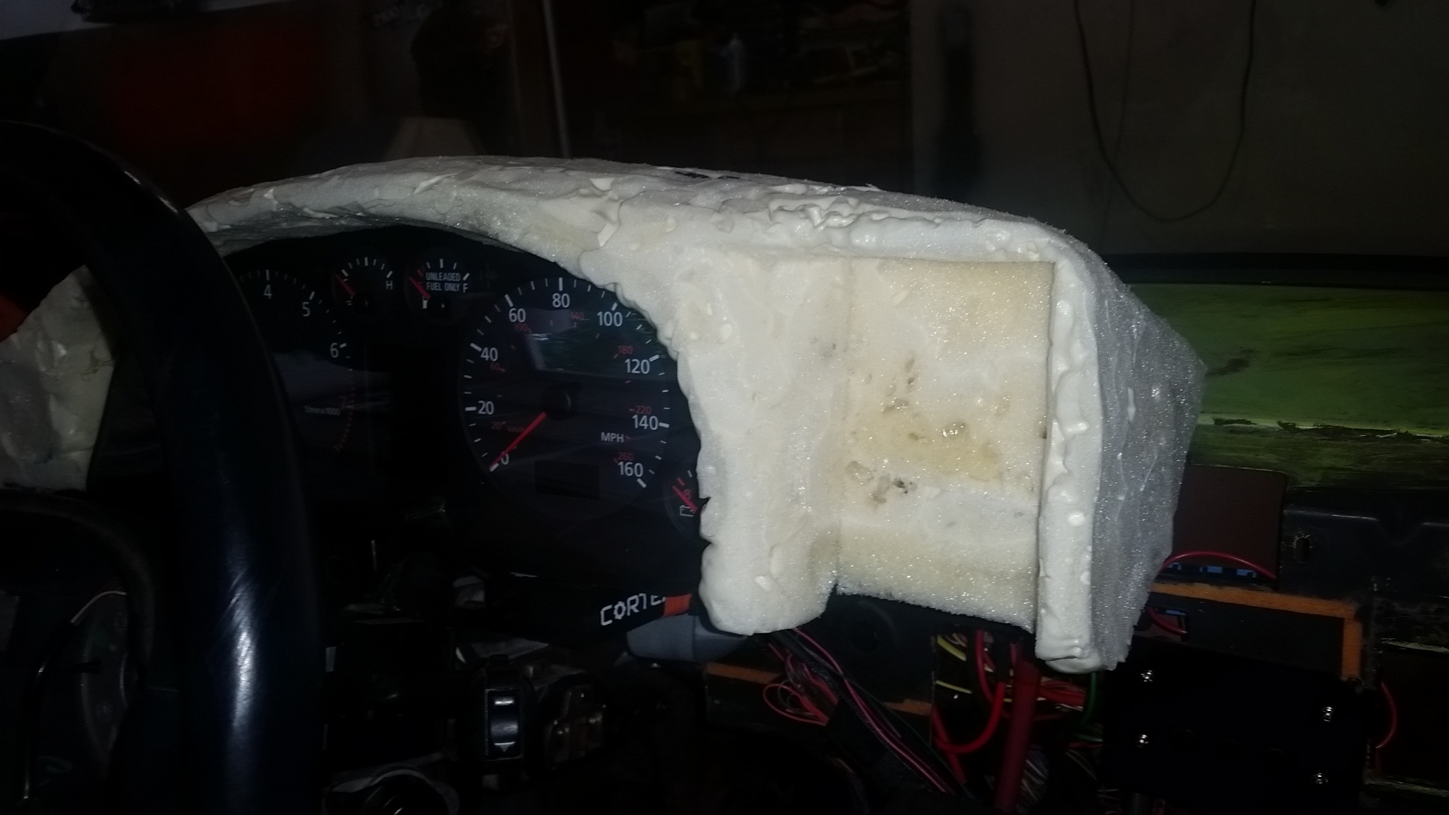 Rather than re-inventing the wheel here, have you thought about cutting out the gauge pod/binnacle section of your donor dash and incorporating into your design rather than using the foam? |