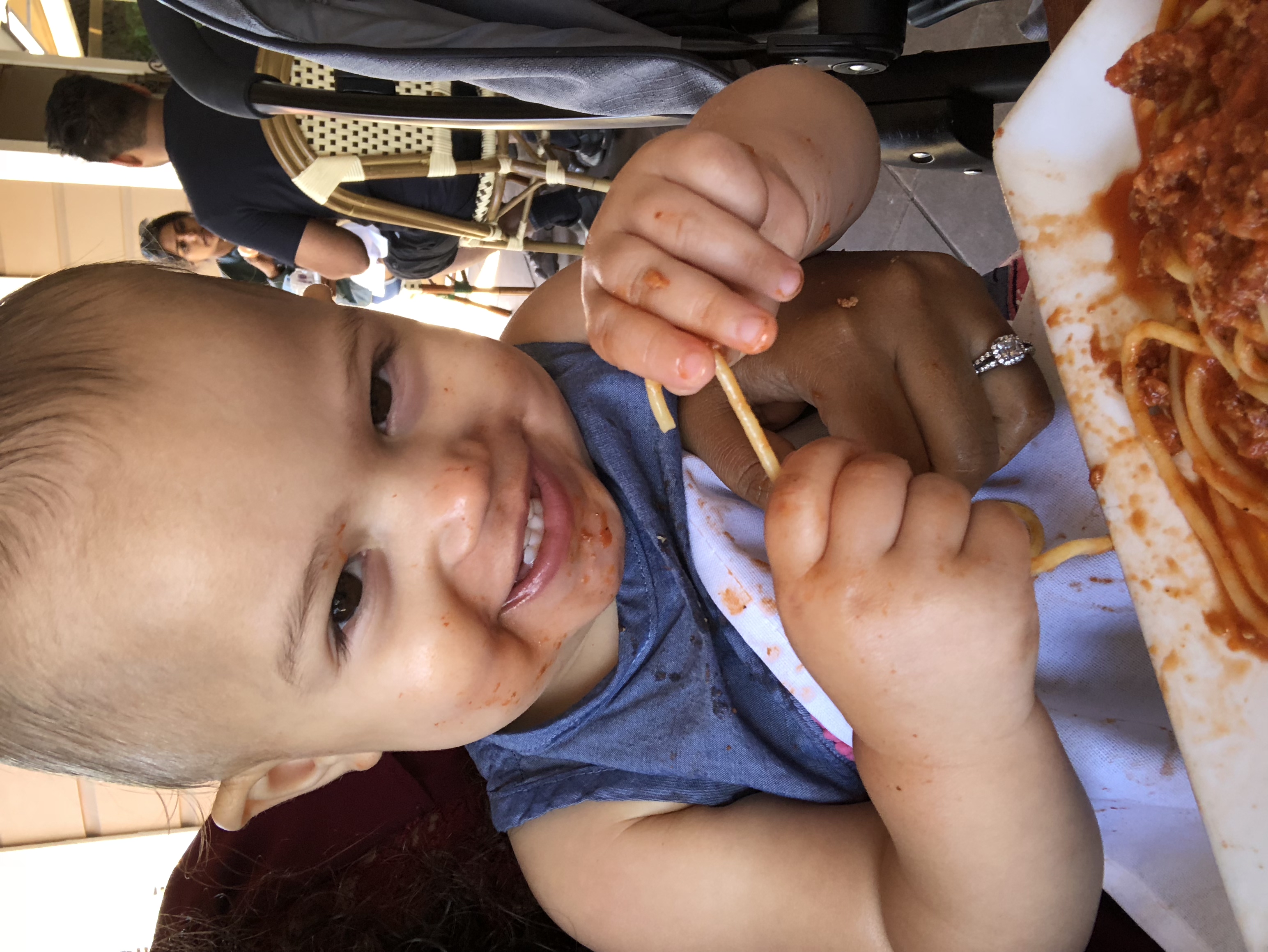 She is too cute, everyone needs a spaghetti meal picture of their kid! I think I know what the problem with your harness is: https://www.youtube.com/watch?v=UOWquP1k6Oc |