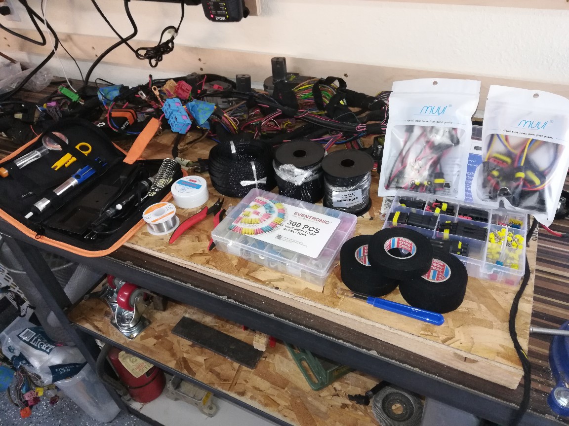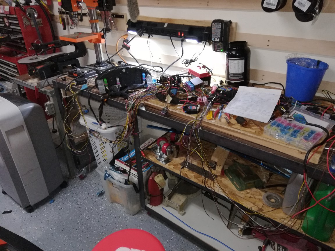 Got some new tools and consumables. Not pictured is a new 60watt soldering iron with orange case (IMG:style_emoticons/default/smile.gif) , flux, solder, heat shrink terminal kit, and on the way is more heat shrink (3:1), and a new butane torch. Last night I spent an hour stripping the wires of tape(thread remover works great if your slow to avoid crossed wires) and cutting a couple unused plugs out. Probably a pound of wire removed. I'll weigh it all when done. I've got to do this real slowly to not cut anything critical out. More tools...nice! Things I don't see in the picture....safety glasses, a carbon filter exhaust fan and a "third hand" (IMG:style_emoticons/default/smile.gif) Safety glasses are directly above the table. That big ass fan isnt big enough for you? And nope, I dont have a "third hand" yet. Im thinking of putting a "T" track in the front of my table and putting a third hand in it. Havent gotten around to soldering yet, just thinning out the harness still (And probably for another couple weeks if I work on it every other night). |
