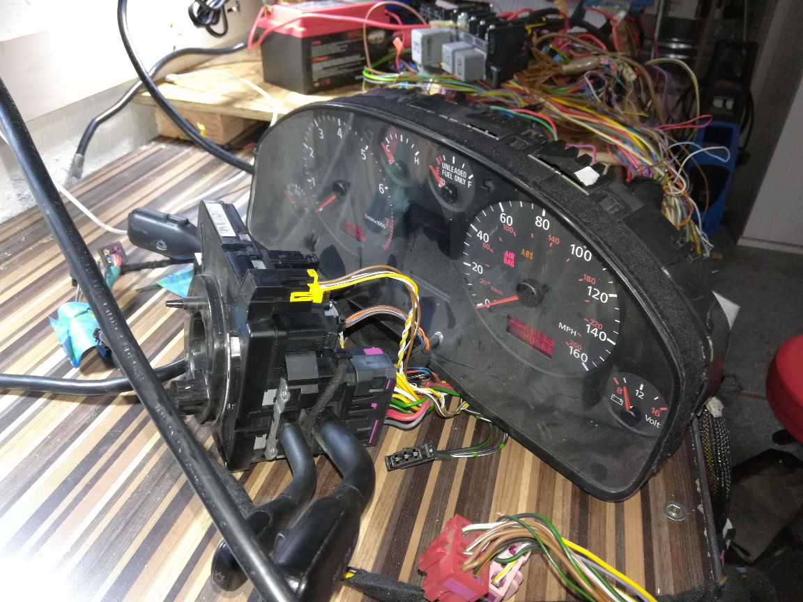 Cleared out some more wiring but as I was doing the light wiring I got worried that I was clearing out too much... So I removed the relay holder, the turn signal/wiper/headlight stalks and the ignition switch and my battery and set it all up on the bench. I was able to figure out the headlights but I didn't get the turn signals to work with a test light. So I'm going to finish up the wiring the best that I can tell for the lights and add some connectors at appropriate lengths and then I will put it in the car. I suspect that it needs more bulbs/resistance to work. The hazard switch works great and it's what holds the turn signal relay.