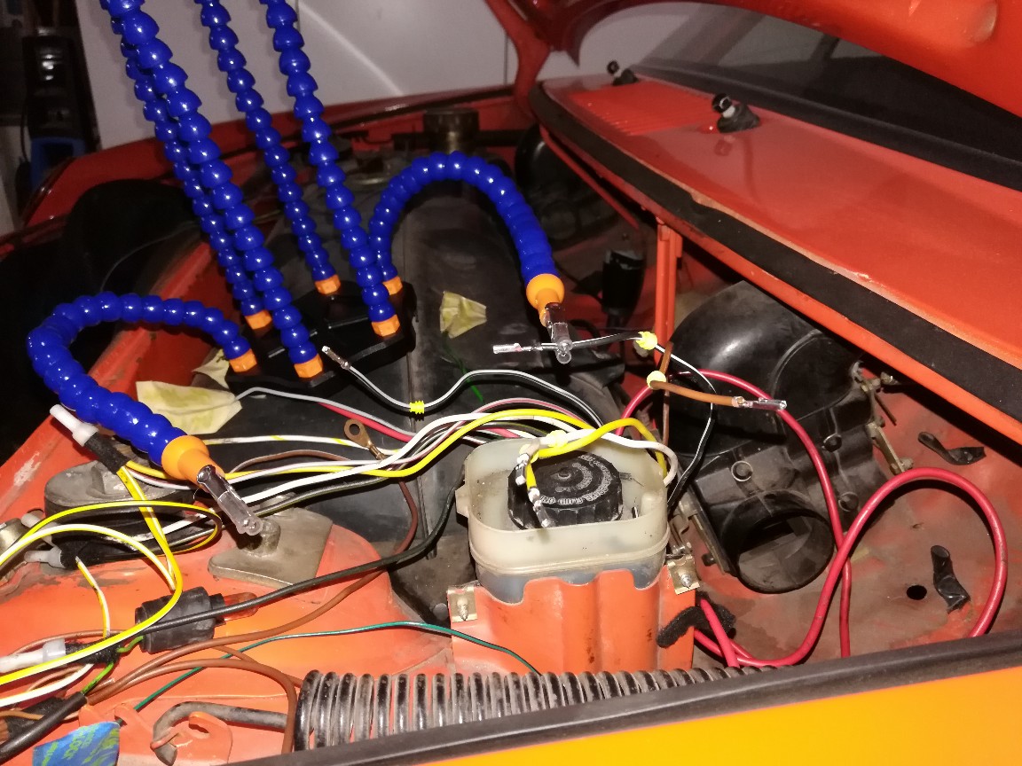 Cleaned up a bit more. Working on the connections to the 914 body harness/lights. Decided to try the new connector hardware. Works pretty good but it needs the special tool or else it's pretty difficult to install. I soldered them when I was done with crimping them.