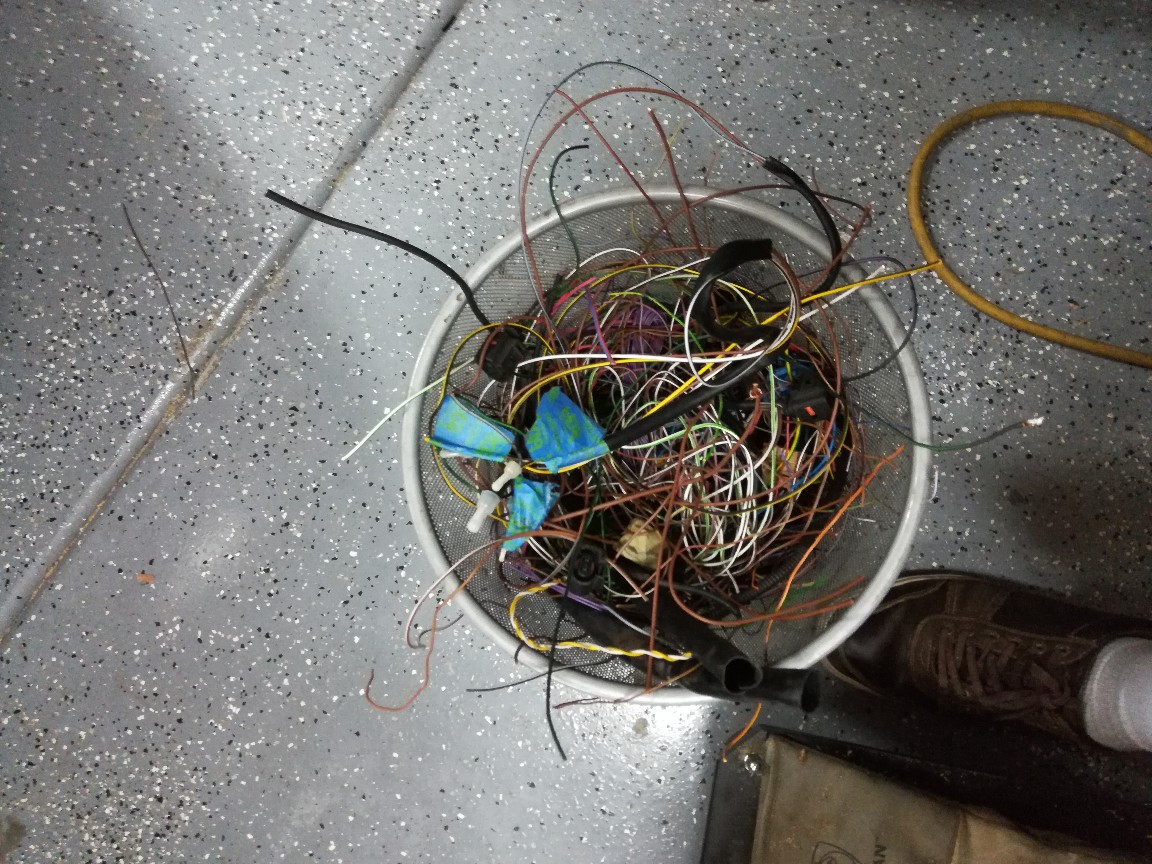 Just as a side note, I'm pinning all these connectors by hand. It typically takes me 45mins per side to do these for say a 5 wire connector. It involves making sure the wires are long enough, adding if necessary then taping the wire leading up to the connector so they don't move, cutting them all to the same length, stripping 3/8" off each one (if it's a thick wire I can use my strippers, else I use a razor blade on the thin wires.) I then put the pin on and butt the second prong to the wire sleaving. Work the connection pins over with my tool so they will fold under each other or wrap the wire when crimped and crimp with my tool. Repeat for the rear pin holding the wire. Then squeeze up the insulating grommet. If it's a thin wire I fire up the soldering gun and tin the wires in the connector really quick. Once that's good I repeat for all the wires. Finally I tape them together at the ends and feed in the wire sleaving I use and cut to length burning the ends so they don't split. I throw some heat shrink down in multiples as well as my new super awesome 4:1 shrink in about a 2.5" length. I shove the wires in the connector making sure they go in all the way and click (Sometimes pulling them into place with a needle nose). Then push the weather seal into place by hand followed by a special tool I made to get them as deep as possible. Check to make sure all the pins are in the correct angle and hot glue the remaining space in the connector (1/4"). I slip the wire sleeve up to the edge of the connector while the glue is still hot and run one layer of tape to make sure it stays while heat shrinking. I apply the smaller heat shrink (both ends of the sleeping) and finalize it with the big heat shrink around the connector which takes some time and careful work with the heat gun. At this point I test the connections wait for the shrink to cool and admire my handiwork. Speaking of... this was 3 hours of work... At this point I have been spending 10 hrs a week in the garage (typically from 9am to 1am, Friday and Saturday nights and a bit here and there. On this wiring for the past 5 weeks... I'm pretty tired of it now... It's relaxing and I can listen to some shows my wife and girl don't like but still. |