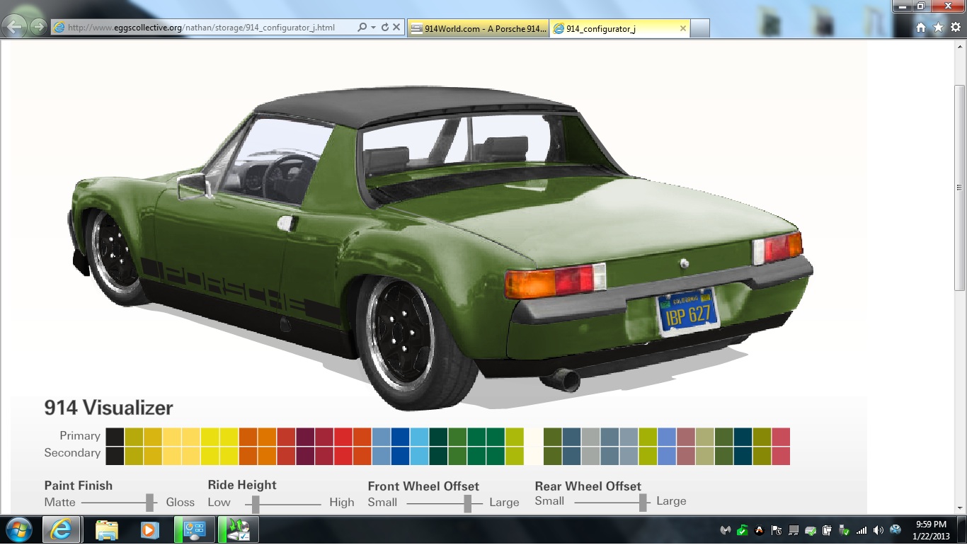 Number of downloads: 88It is a pretty big file, which is ideal but it takes awhile to load. Once it was cached on my machine here it came up quick though - seems to work fine for me. This is with the options toggled off. I'm not sure what you mean be "clear area"? I'm thinking maybe you have an old version with an output textbox box cached on your machine maybe? Try clearing your cache and reloading it - when the page isn't open. I've redirected the 2 or 3 common previous versions to the current one so I'm pretty sure we're looking at the same thing. - like click on the link in my forum signature and compare the url/address you were looking at? That is the factory 914_8 I've made there, but with ca plates btw (IMG:style_emoticons/default/beerchug.gif) ![]() |