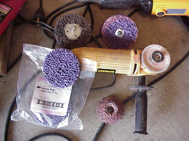 (IMG:http://www.914world.com/members/ginter/MVC-237F.JPG) The top right one is the type you can buy at FLAPS. The 1/4" collet is OK, but a drill is slow, and a air die grinder has no torque. The lower left (bag of purple units) is available at most larger auto body supply stores. You can put them on a 1/4" collet, but I put them on my grinder. The lower left small-ish unit is the one I wore down to a nub. Eastwood sells a 7" one with a backing pad. I need to order a few of those. I can't find them locally. This is the package of 4 disks themselves. Part number is visible. (IMG:http://www.914world.com/members/ginter/MVC-238F.JPG) |