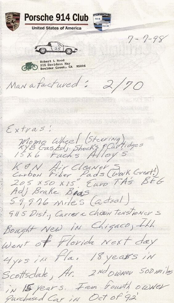 I made it back - Barely Glenn Stazak wrote me an email. In the thread that ensued, some new information has come to light with regard to my car. He also provided me with some documents and a letter from Bob Wood himself. Thanks Glenn! I'm going to post some of the info from Glenn, and from Larry Lee's db that he provided me with prior to my purchasing the car. For those of you that don't know, Larry has been collecting 914 advertisements from Excellence and Pano and other sources for many years. Feel free to email him at llee50@stny.rr.com Larry Lee sent me the following upon my request to him for information in which I provided little else than the VIN number: Hi Mike, Yes, I have 2 entries on your car. One from 1987 and the other from 1992. This car hasn't changed hands very much. Looks like it spent most of its life in Arizona. Hope this helps. 70 914 2 "Roadster" 914043#### "Orange/blk int, exc orig cond, Ariz rustfree car, reblt 2.0E eng, S pists, Turn 6 swaybar, #140 springs, alloys, gas shocks, new mast cyl, new rotor & pads." $10500 "Ron" "Vance" "1932 E. Meadow Dr." "Tempe" "AZ" "85282" "602-967-9143" 9/1/1987 "Panorama" PG 105 70 914 0 "Roadster" 914043#### "Orange/blk, mech sound, Carrera chain tensioners, s/s brake lines, proportioning valve, dry cell battery, H-4 headlts, 205/50-15 TAs, Fuch whls, factory sway bar, recent major svc and reblt carbs, new clutch, 11 blade fan, alternator and ""S"" distributor." $0 "Don" "602-997-2785" 12/1/1992 "Excellence" PG 116 This database is an effort by Porsche 914/6 enthusiasts to document these rare and unusual sports cars. 3363 of these cars were produced over 3 short years starting in 1970 and in the intervening decades, these few have left their mark on the streets and race tracks of the world. Due to their age and competition potential, many of these cars have compiled interesting and colorful histories. The purpose of this effort is to provide current owners a place to research their cars and a place for them to share any research they might have done. For the prospective buyer, this provides a place to research cars they might consider buying. The things that you might find in this database include information on originally installed equipment, original engine and transmission serial numbers, previous advertisements in national magazines, names and addresses of previous owners and owner submitted information. This database is intended to promote the preservation of Porsches first mid engined roadster and is aimed at those who appreciate these cars. My database currently has 2385 entries with 770 unique serial numbers. There were 3363 of these cars produced with about 1700 of them being officially imported into North America. The information in my database comes from several sources, these include: Every issue of Panorama from 1970 to date, Every issue of Excellence from April 1987 to date, Every issue of Road & Track from 1970 to date, Some issues of Hemmings from 1998 to date, Defunct publications like Porsche Trends Gallery And other random publications like AutoWeek. Various web sites from about 1996 to date. The web sites include among others: Road Glue http://www.roadglue.com/ 914/6 Registry http://www.stazak.com/914reg/ 914 club http://www.dgi.net/914/ The Rennlist http://www.rennlist.org/ Automobile Atlanta http://www.autoatlanta.com 914 Owners Association http://home.earthlink.net/~deeds/ Ebay http://www.ebay.com/ And random other web sites like PCA region web sites and personal web sites. Also personal observations of 914/6s at various East Coast and Midwest events. I used to do a price run on the database from time to time but haven't been able to do this since I changed database programs due to Y2K issues. The following chart is the output of the price run. Its getting kind of stale but should give you some idea of the price trends for these cars. PRICE HISTORY FOR TYPE 914-6 REPORT DATE 09/13/99 21:02:11 FOR CARS WITH PRICES BETWEEN $1 AND $99999 AVERAGE MAXIMUM MINIMUM NUMBER OF ADVERTISED ADVERTISED ADVERTISED DATA YEAR PRICE PRICE PRICE POINTS ------------------------------------------------------------------ 1971 5300 5300 5300 1 1972 5725 9000 4750 10 1973 4980 6195 3800 10 1974 5467 8950 3700 17 1975 5710 11000 3800 47 1976 6348 11000 4375 25 1977 8115 15500 4750 32 1978 8594 15000 900 49 1979 8033 15000 3600 38 1980 9124 19500 2500 39 1981 10296 25000 2500 38 1982 12297 25000 5700 58 1983 12392 55000 1500 59 1984 10936 23000 3500 73 1985 12580 23000 5750 87 1986 12156 30000 6500 59 1987 13831 85000 6000 71 1988 13832 45500 750 51 1989 11842 30000 3500 57 1990 16109 40000 4200 40 1991 19964 85000 750 81 1992 17067 45000 4250 82 1993 15373 45000 4000 115 1994 13850 50000 4500 127 1995 15646 44995 4750 84 1996 17606 35000 7500 53 1997 17781 40000 5000 69 1998 18086 45000 3000 52 1999 18477 29500 4000 24 Larry Lee Vestal, NY. |