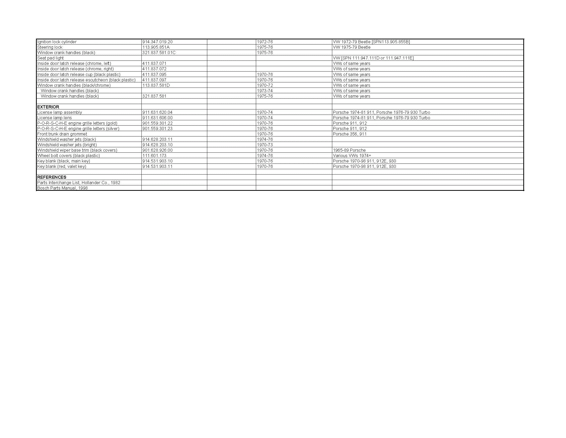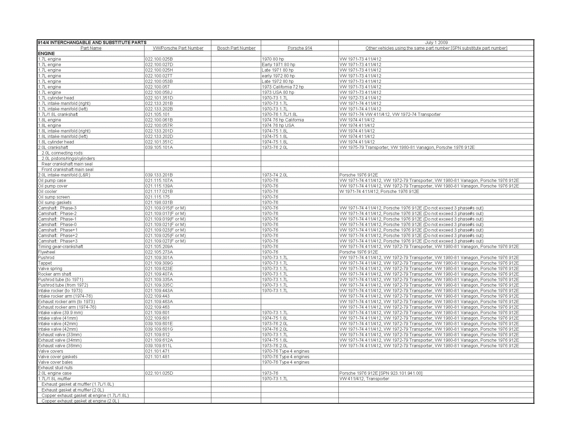 1.) Some parts are NLA from Porsche but are available from VW dealers 2.) In most cases you will find that the parts are cheaper when purchased from VW dealers vs. Porsche dealers. Most parts are easy to spot based on the 021., 022. or 039. prefix. Let me know if anyone knows of other parts that are interchangeable. I had to take the image quality down to Gif to get it to fit. If anyone know how to convert it to better quality, I can email them the complete Excel file. Attached thumbnail(s) |